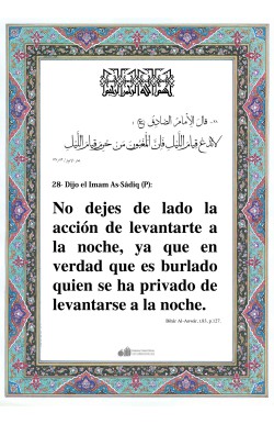 Del Imam Ar-Ridâ (P): Le fue ordenada a la gente la lectura (del Corán) durante la oración para que el Corán no fuera dejado en el abandono y desaprovechado, sino que fuera memorizado y estudiado, y no olvidado e ignorado. Y ciertamente que (esta lectura) sólo es comenzada con (la sura) Al-Hamd y…
