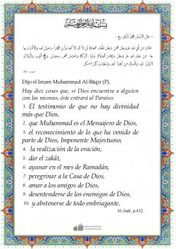 “Sin duda que los Imames son los pilares de Al-lah para Sus criaturas, peritos Suyos respecto de Sus siervos, no penetrará en el Paraíso más que quien los conoce y ellos conocen, y no penetrará en el Fuego más que quien los rechaza y ellos lo rechazan”.