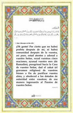 “Por cierto que yo dejo entre vosotros a las dos preciosidades que si os aferráis a ambas no os desviaréis después de mí, una de ellas es más grande que la otra: El Libro de Al-lah, un cordel extendido del cielo a la tierra, y mi prole, la gente de mi casa (…