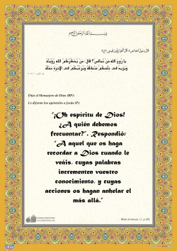 Del Mensajero de Dios (BP): Atención! Aprovechad las reuniones de los sabios, puesto que las mismas son un jardín de entre los jardines del Paraíso, desciende sobre ellos la misericordia y el perdón así como la lluvia del cielo; se sientan frente a ellos siendo pecadores y se levantan habiendo sido…