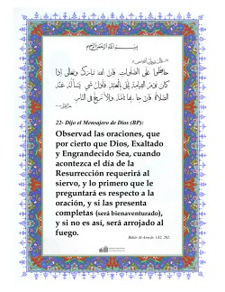 Dijo el Mensajero de Dios (BP): Escuché a alguien proclamar en la presencia de cada oración, que decía: “¡Oh hijos de Adán! Levantáos y apagad de vosotros lo que encendisteis sobre vosotros mismos”.