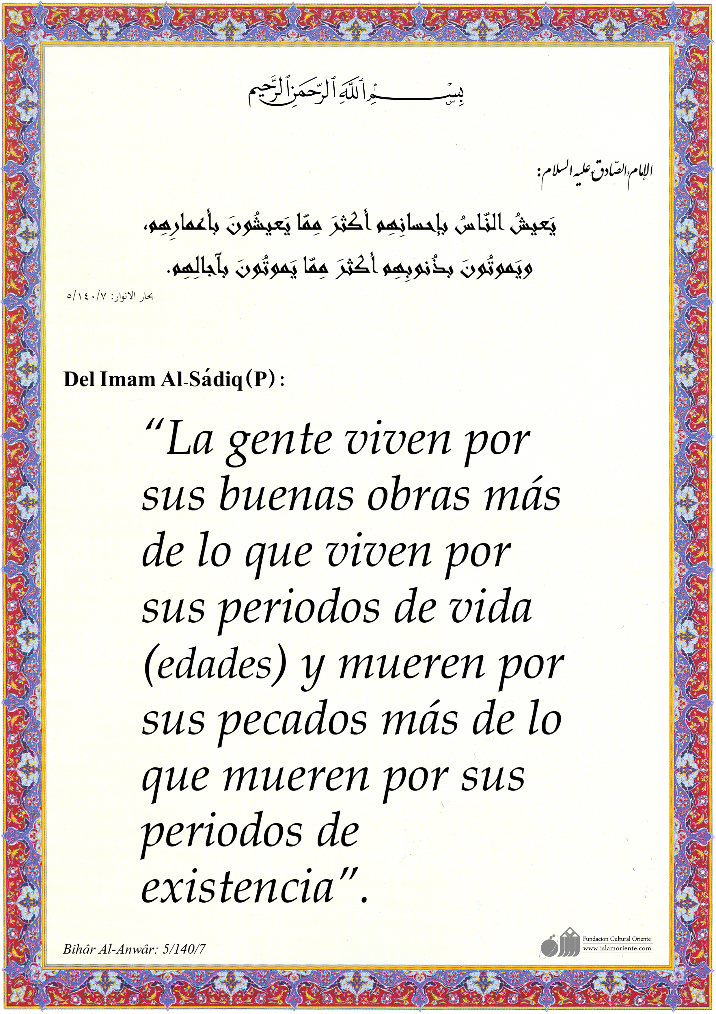 Del Imam Al-Sádiq (P): “La gente viven por sus buenas obras más de lo que viven por sus periodos de vida (edades) y mueren por sus pecados más de lo que mueren por sus periodos de existencia”.