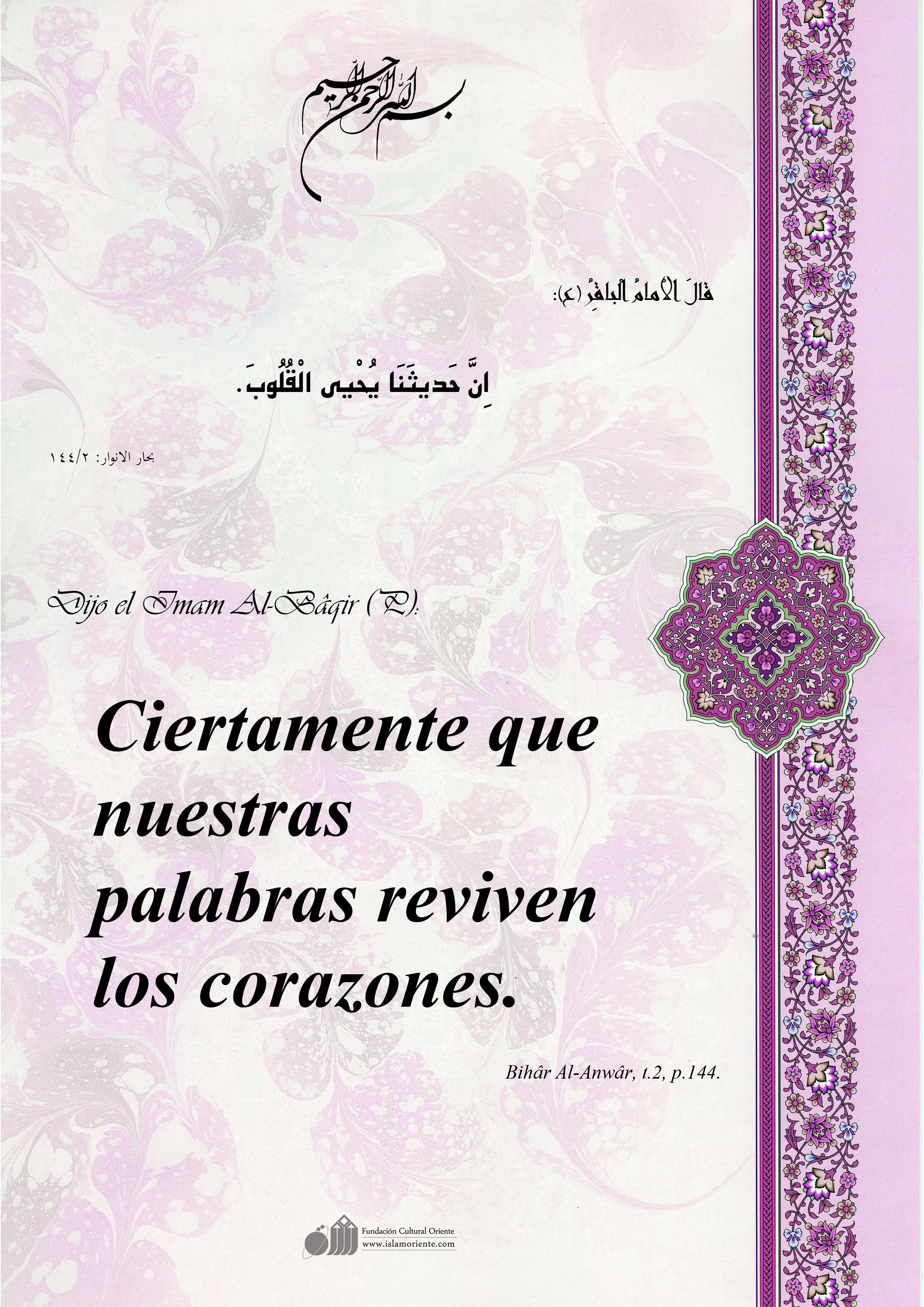 Dijo el Imam Al-Bâqir (P): Ciertamente que nuestras palabras reviven los corazones.