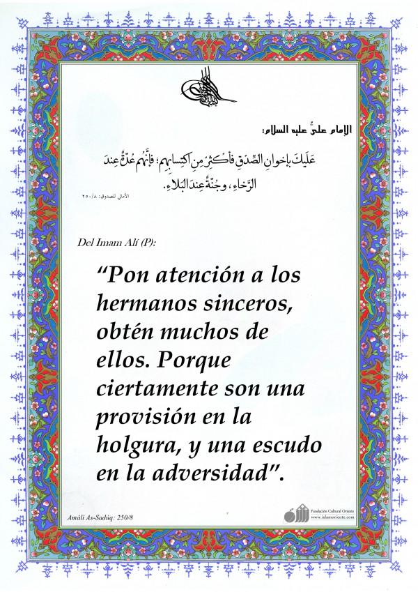 Del Imam Alí (P): “Pon atención a los hermanos sinceros, obtén muchos de ellos. Porque ciertamente son una provisión en la holgura, y una escudo en la adversidad”.