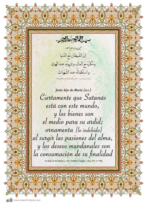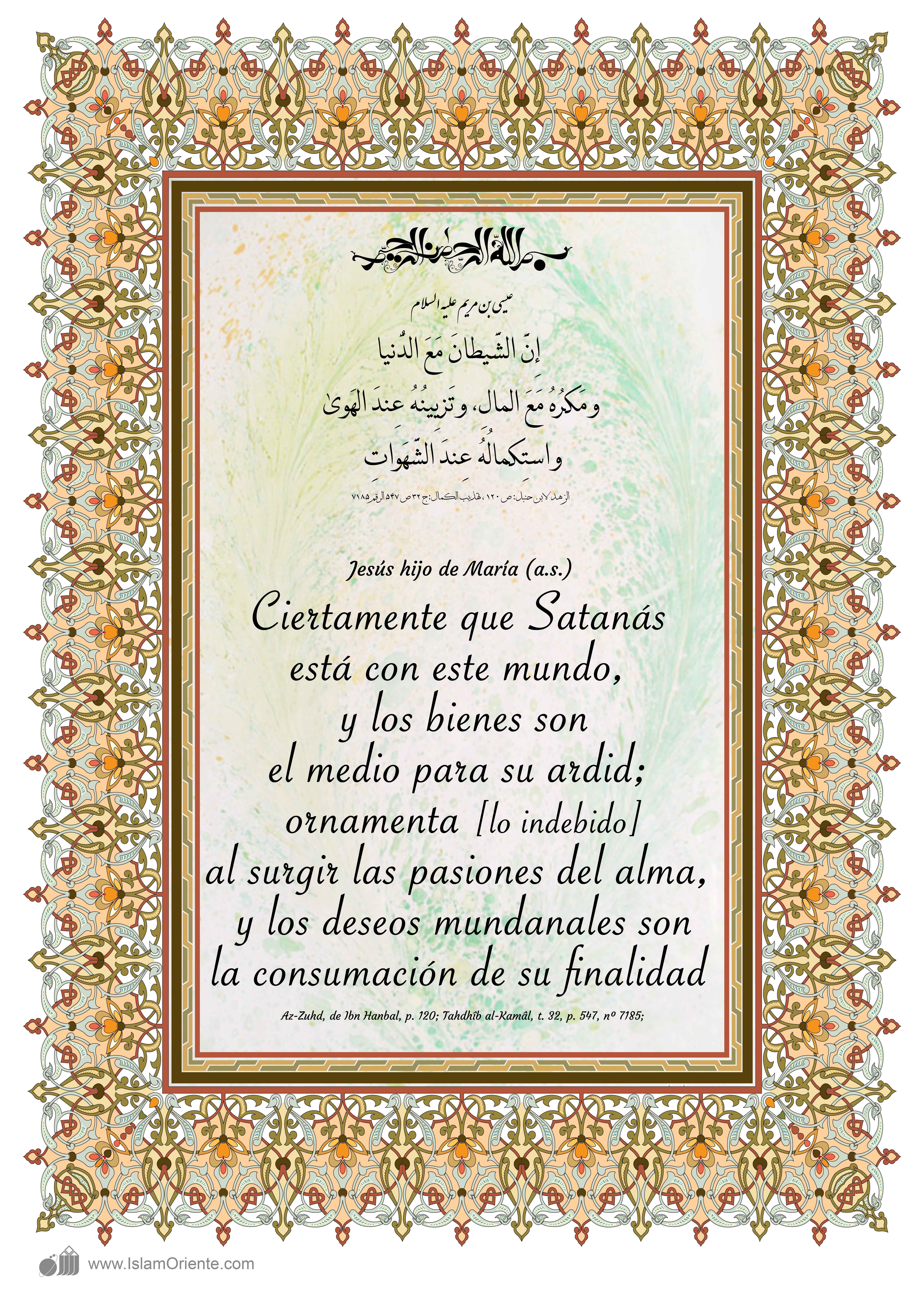 Jesús hijo de María (a.s.): Ciertamente que Satanás está con este mundo, y los bienes son el medio para su ardid; ornamenta [lo indebido] al surgir las pasiones del alma, y los deseos mundanales son la consumación de su finalidad.[2]