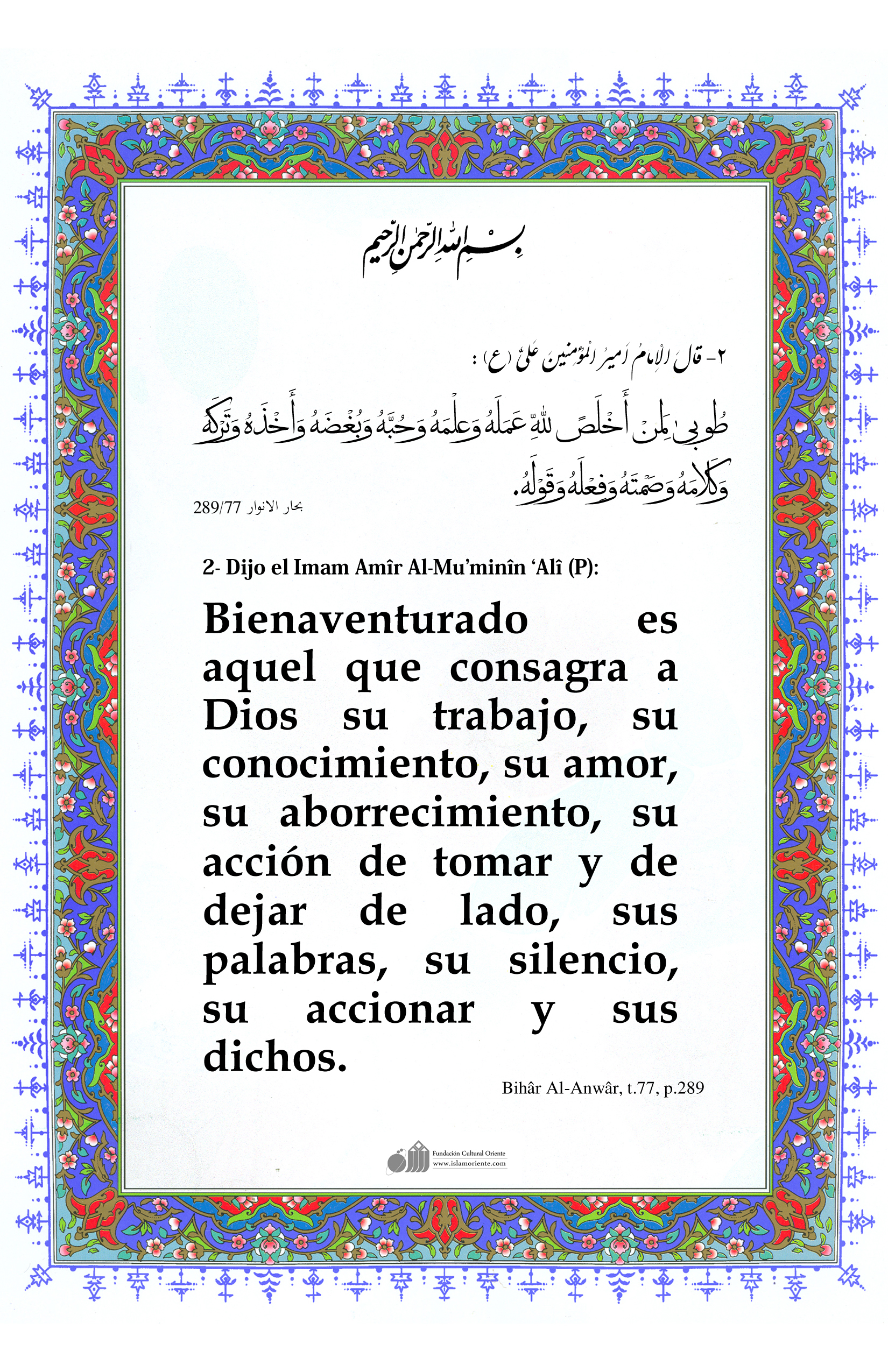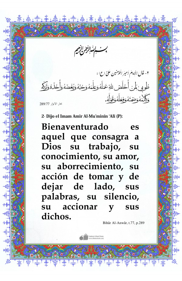 2- Dijo el Imam Amîr Al-Mu’minîn ‘Alî (P): Bienaventurado es aquel que consagra a Dios su trabajo, su conocimiento, su amor, su aborrecimiento, su acción de tomar y de dejar de lado, sus palabras, su silencio, su accionar y sus dichos.