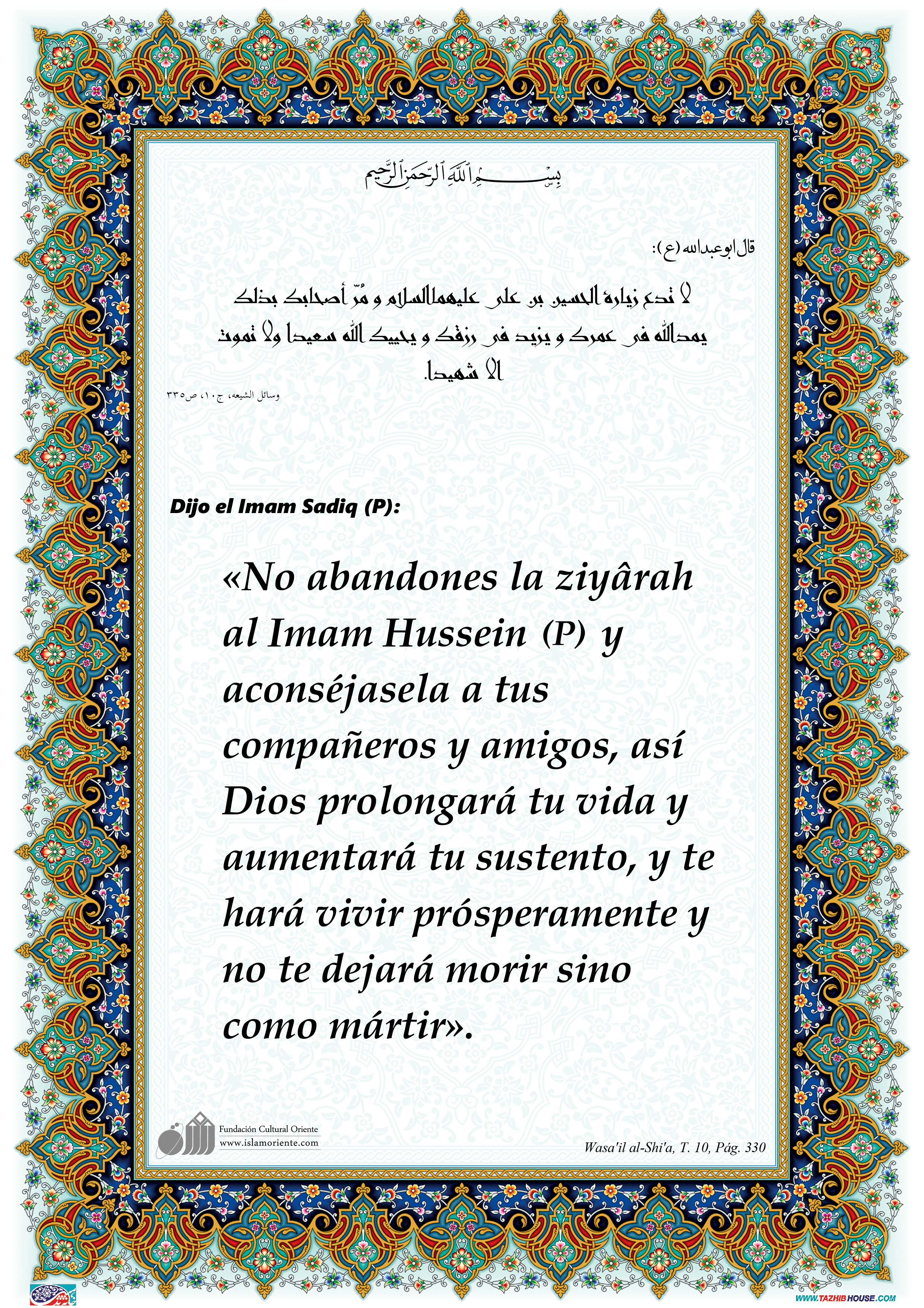 Dijo el Imam Sadiq (P): «No abandones la ziyârah al Imam Hussein (P) y aconséjasela a tus compańeros y amigos, así Dios prolongará tu vida y aumentará tu sustento, y te hará vivir prósperamente y no te dejará morir sino como mártir».