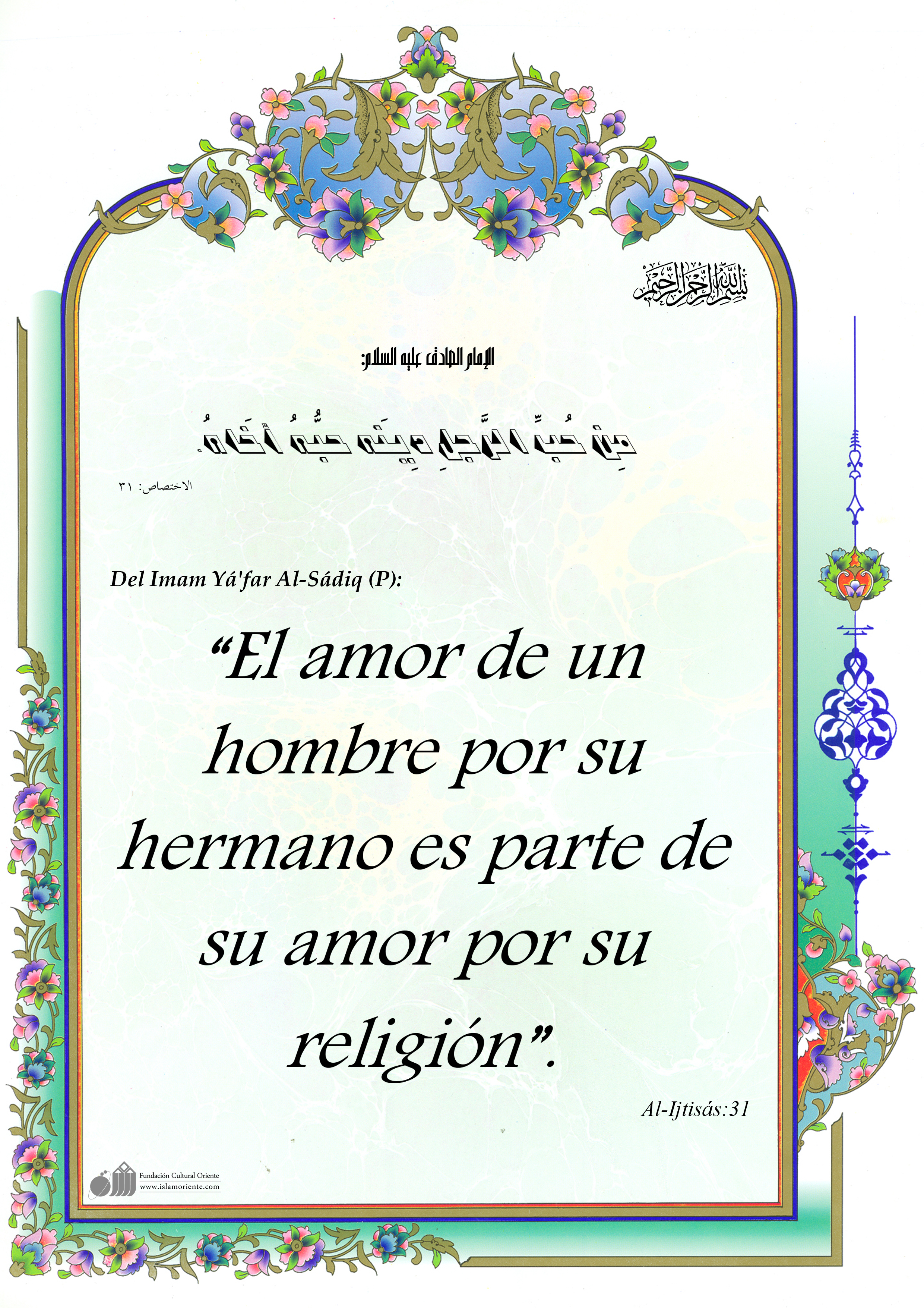 Del Imam Yá'far Al-Sádiq (P): “El amor de un hombre por su hermano es parte de su amor por su religión”.