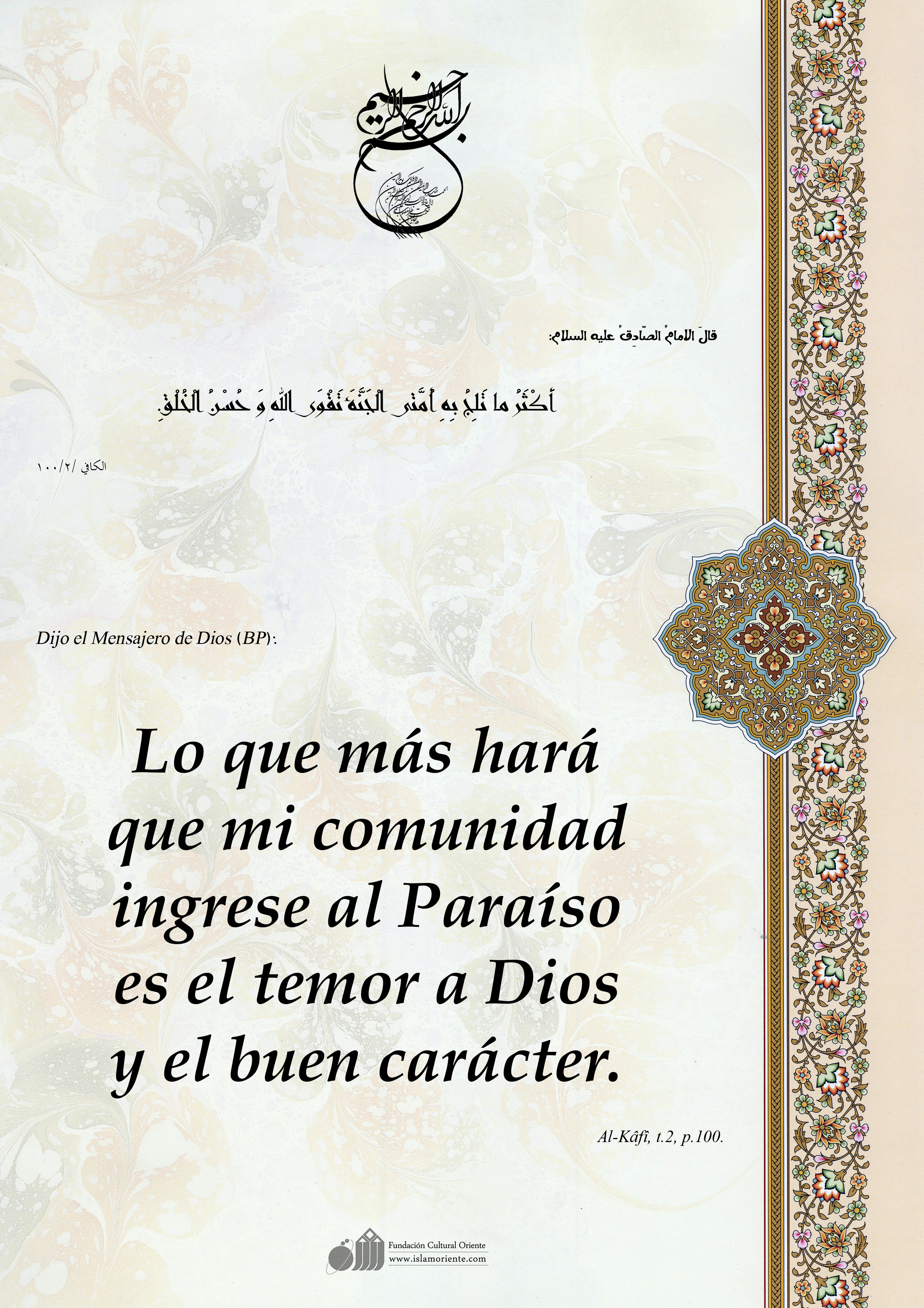 Dijo el Mensajero de Dios (BP): Lo que más hará que mi comunidad ingrese al Paraíso es el temor a Dios y el buen carácter.