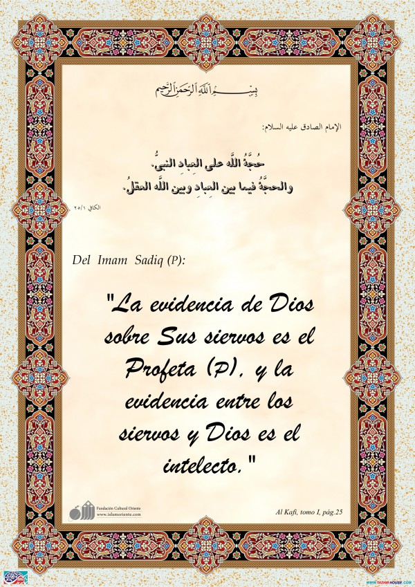 Del Imam Sadiq (P): "La evidencia de Dios sobre Sus siervos es el Profeta (P), y la evidencia entre los siervos y Dios es el intelecto."
