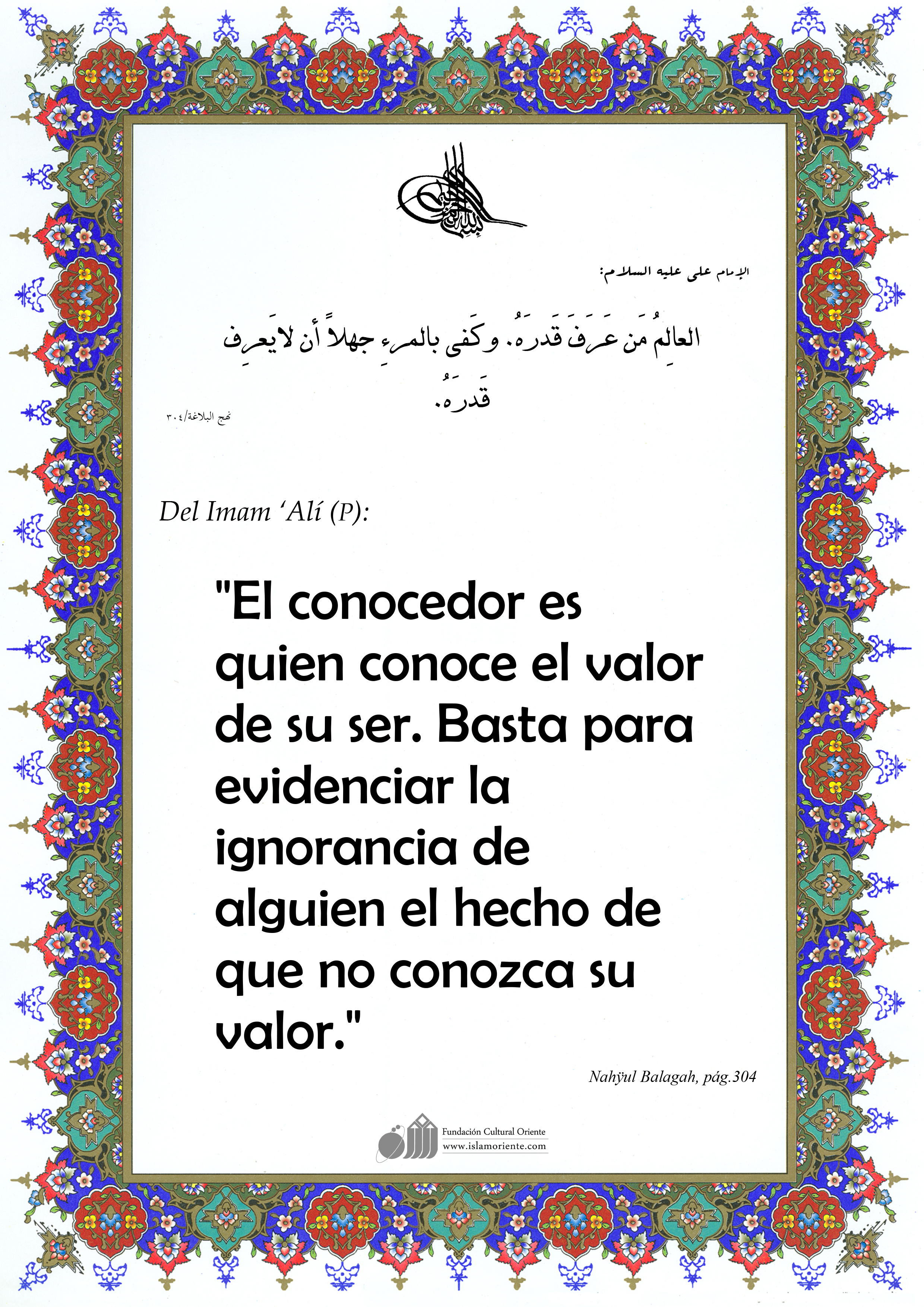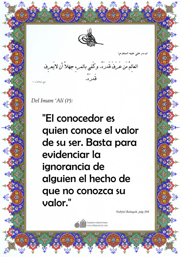 Del Imam ‘Alí (P): "El conocedor es quien conoce el valor de su ser. Basta para evidenciar la ignorancia de alguien el hecho de que no conozca su valor."