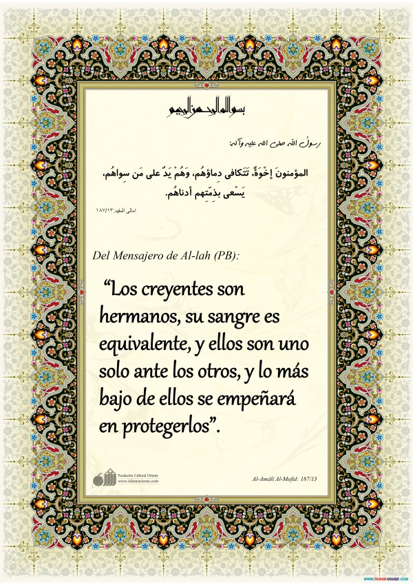 Del Mensajero de Al-lah (PB): “Los creyentes son hermanos, su sangre es equivalente, y ellos son uno solo ante los otros, y lo más bajo de ellos se empeñará en protegerlos”.