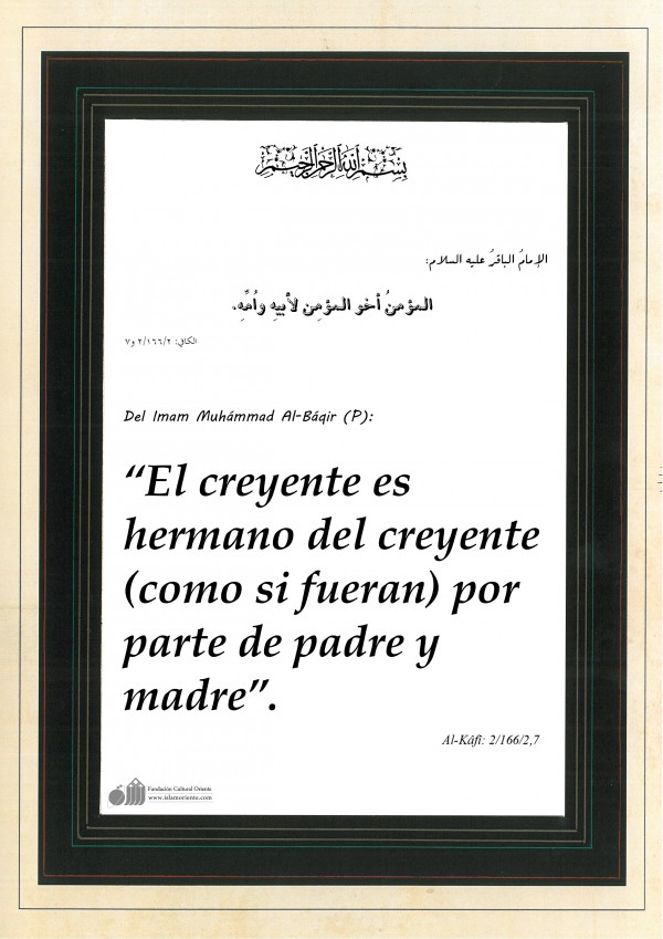 Del Imam Muhámmad Al-Báqir (P): “El creyente es hermano del creyente (como si fueran) por parte de padre y madre”.