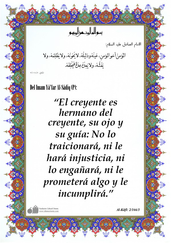 Del Imam Yá'far Al-Sádiq (P): “El creyente es hermano del creyente, su ojo y su guía: No lo traicionará, ni le hará injusticia, ni lo engañará, ni le prometerá algo y le incumplirá.”
