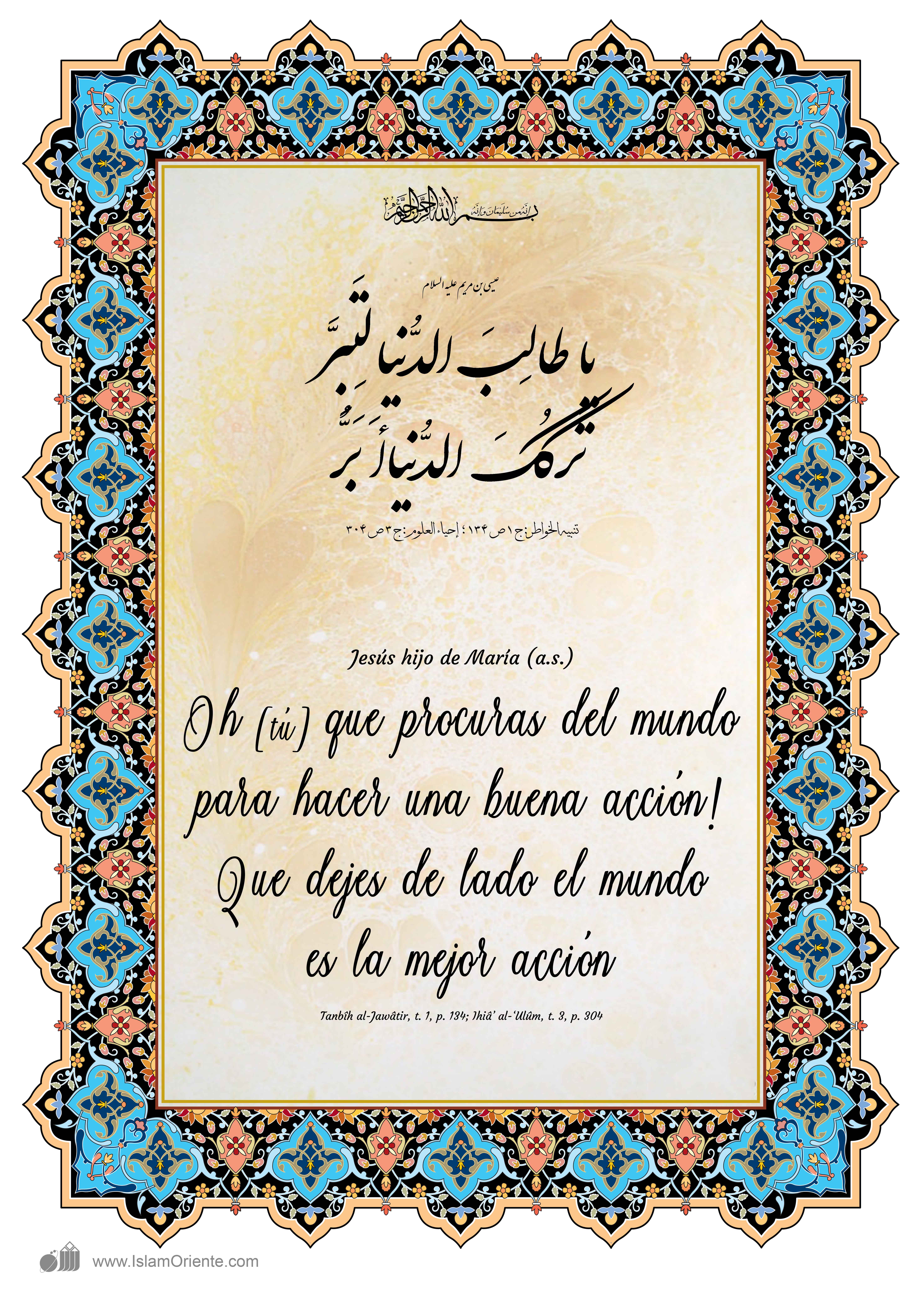 Jesús hijo de María (a.s.): ¡Oh [tú] que procuras del mundo para hacer una buena acción! Que dejes de lado el mundo es la mejor acción.[2]