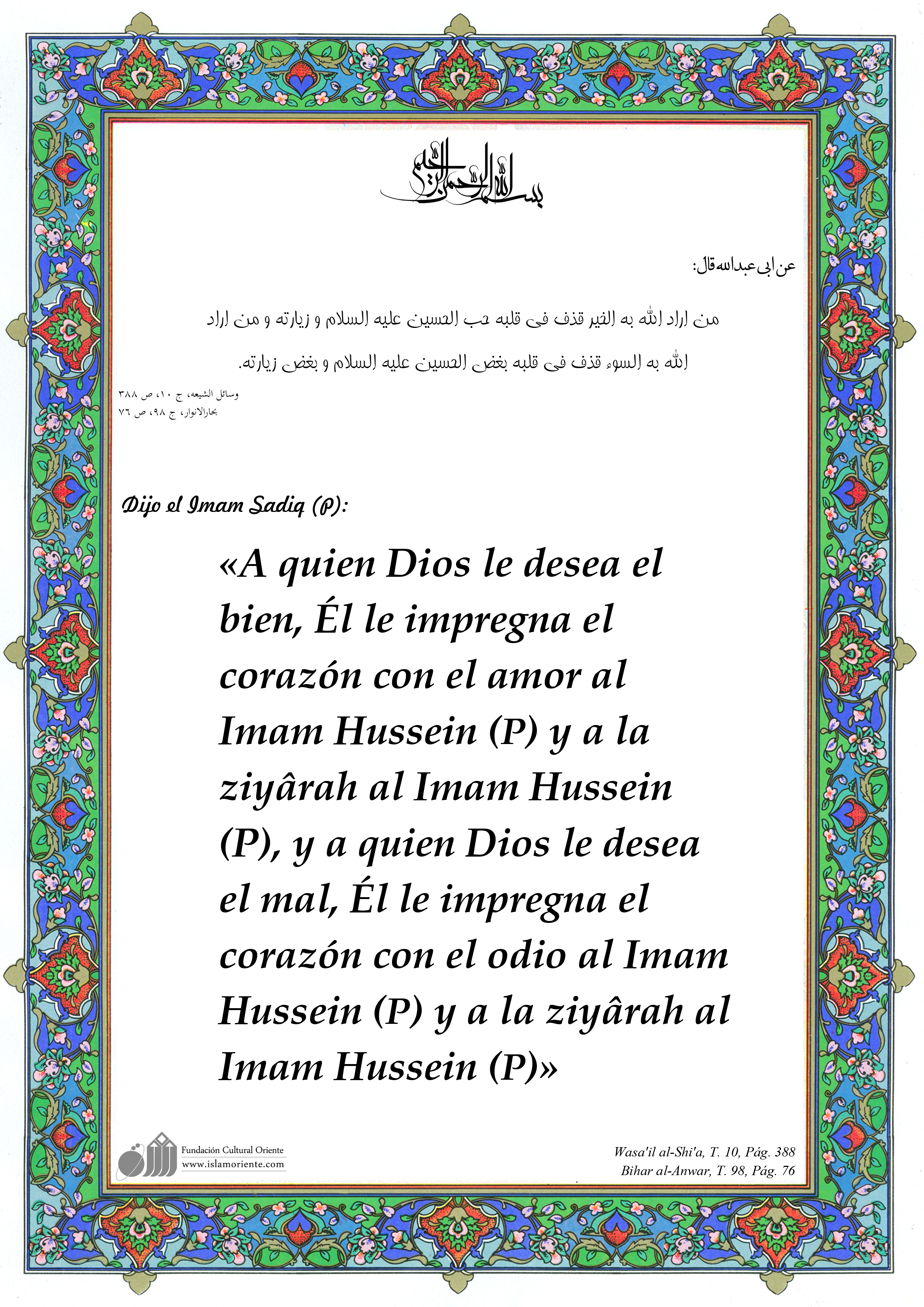 Dijo el Imam Sadiq (P): «A quien Dios le desea el bien, Él le impregna el corazón con el amor al Imam Hussein (P) y a la ziyârah al Imam Hussein (P), y a quien Dios le desea el mal, Él le impregna el corazón con el odio al Imam Hussein (P) y a la ziyârah al Imam Hussein (P)»