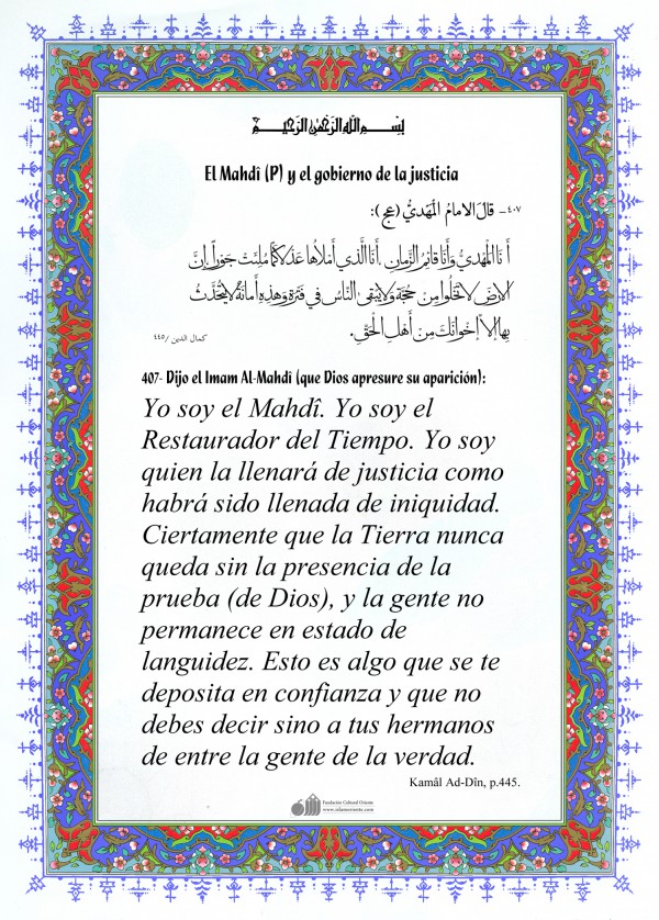Dijo el Imam Al-Mahdî (que Dios apresure su aparición): Yo soy el Mahdî. Yo soy el Restaurador del Tiempo. Yo soy quien la llenará de justicia como habrá sido llenada de iniquidad. Ciertamente que la Tierra nunca queda sin la presencia de la prueba (de Dios), y la gente no permanece en estado de languidez. Esto es algo que se te deposita en confianza y que no debes decir sino a tus hermanos de entre la gente de la verdad.
