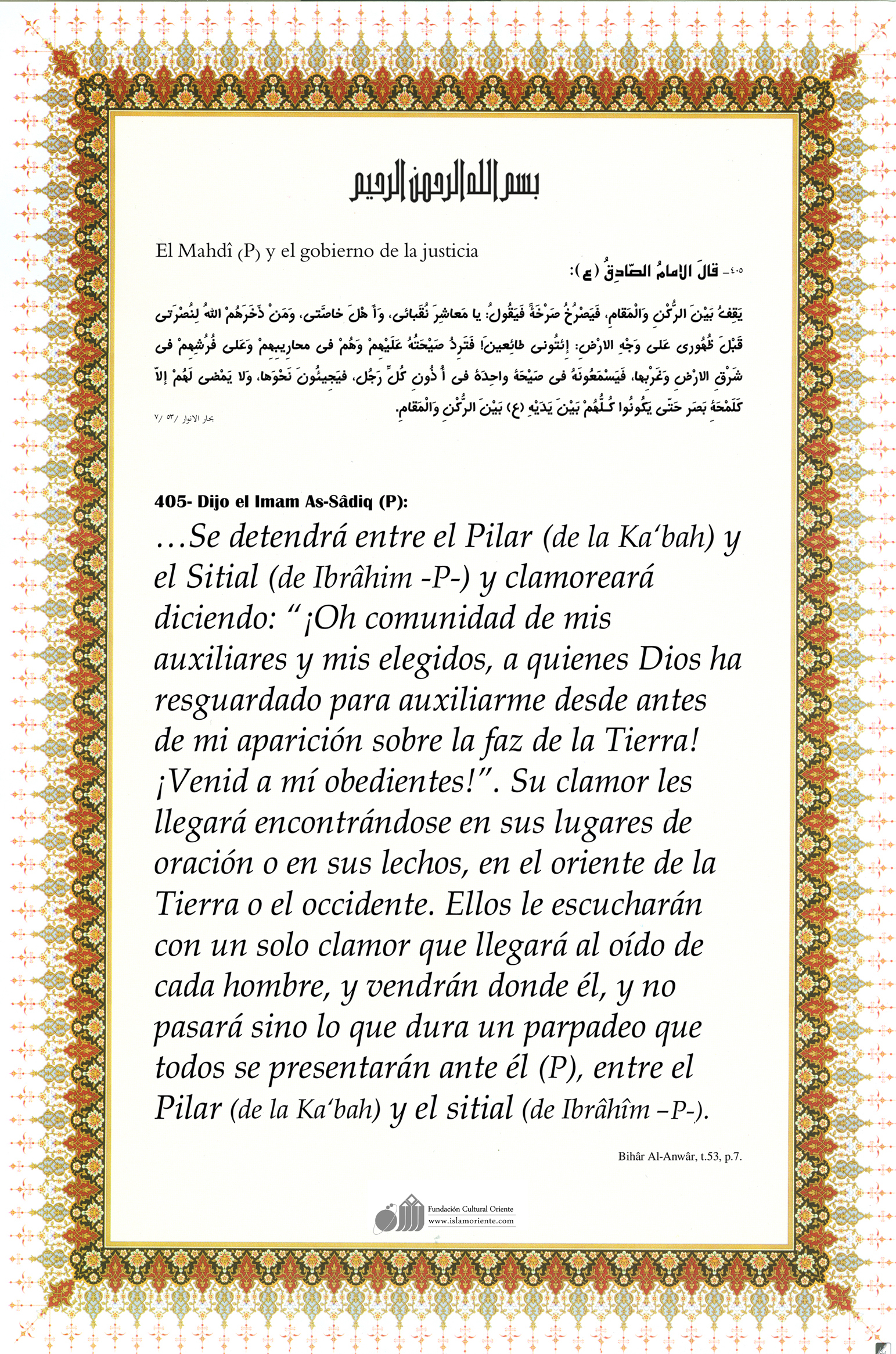 Dijo el Imam As-Sâdiq (P): … Se detendrá entre el Pilar (de la Ka‘bah) y el Sitial (de Ibrâhim -P-) y clamoreará diciendo: “¡Oh comunidad de mis auxiliares y mis elegidos, a quienes Dios ha resguardado para auxiliarme desde antes de mi aparición sobre la faz de la Tierra! ¡Venid a mí obedientes!”. Su clamor les llegará encontrándose en sus lugares de oración o en sus lechos, en el oriente de la Tierra o el occidente. Ellos le escucharán con un solo clamor que llegará al oído de cada hombre, y vendrán donde él, y no pasará sino lo que dura un parpadeo que todos se presentarán ante él (P), entre el Pilar (de la Ka‘bah) y el sitial (de Ibrâhîm –P-).