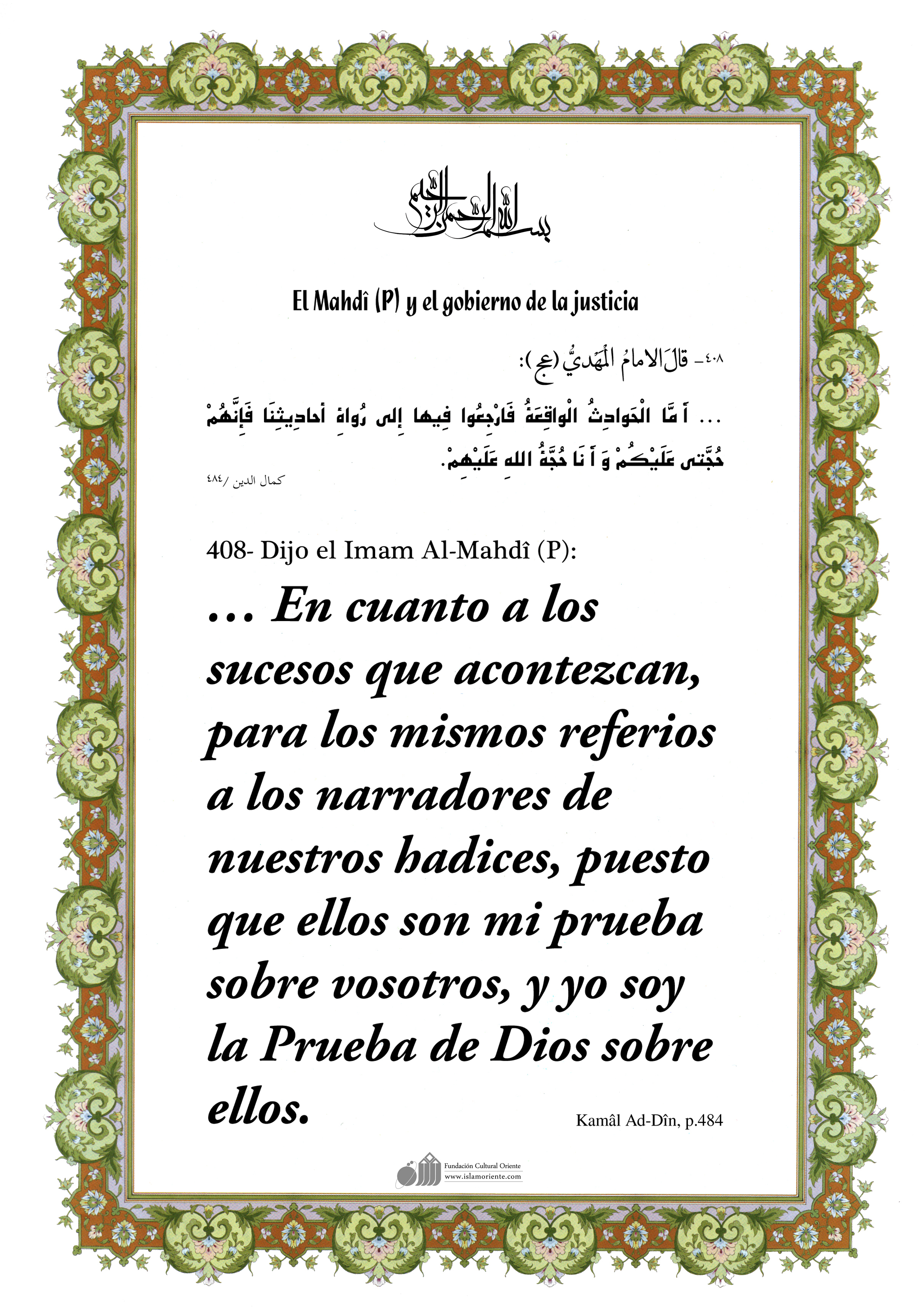 Dijo el Imam Al-Mahdî (P): … En cuanto a los sucesos que acontezcan, para los mismos referios a los narradores de nuestros hadices, puesto que ellos son mi prueba sobre vosotros, y yo soy la Prueba de Dios sobre ellos.