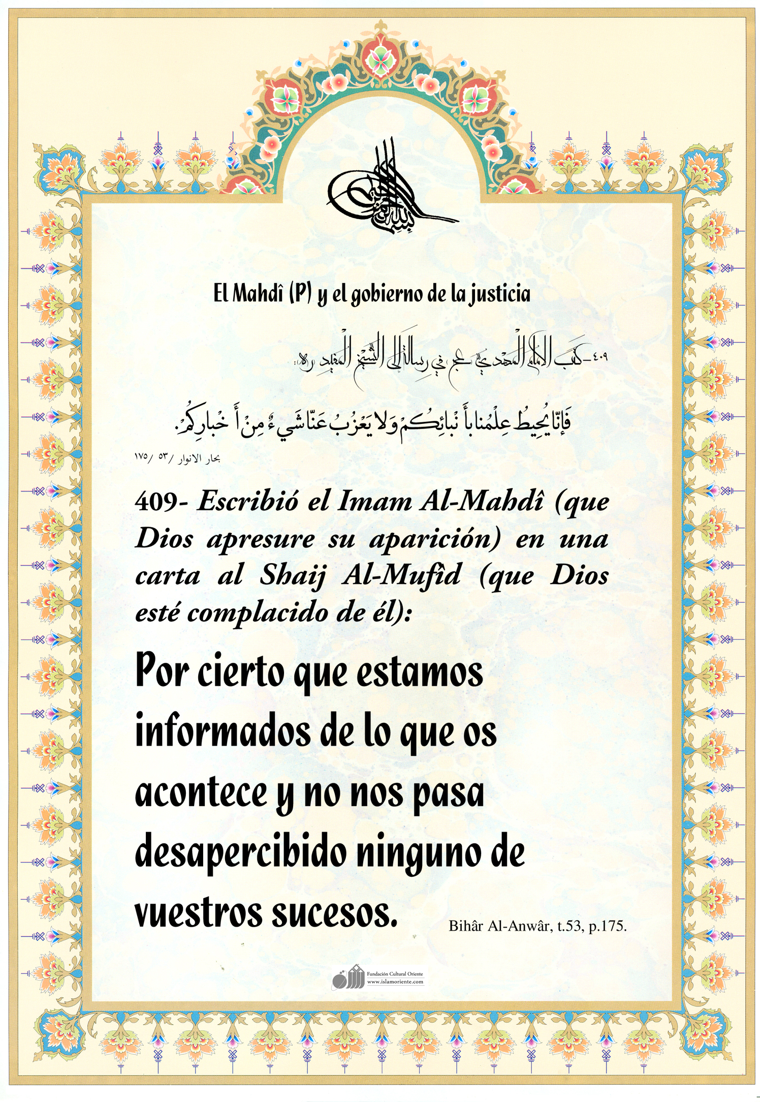 Escribió el Imam Al-Mahdî (que Dios apresure su aparición) en una carta al Shaij Al-Mufîd (que Dios esté complacido de él): Por cierto que estamos informados de lo que os acontece y no nos pasa desapercibido ninguno de vuestros sucesos.