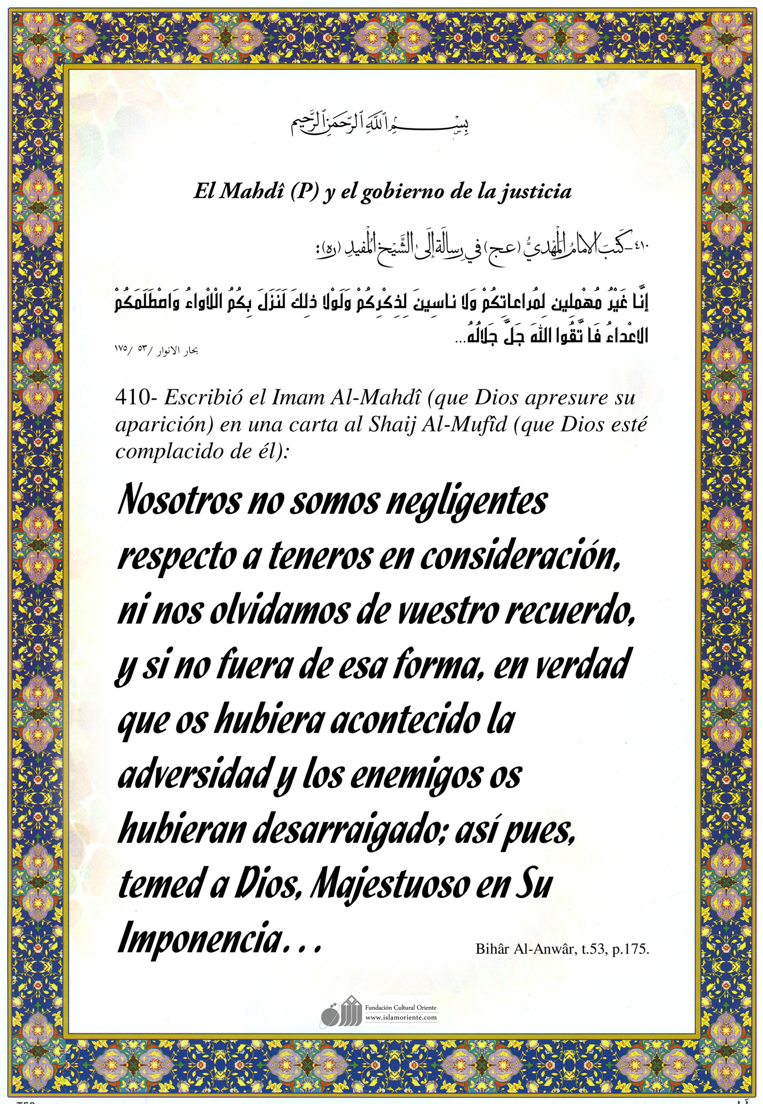 Escribió el Imam Al-Mahdî (que Dios apresure su aparición) en una carta al Shaij Al-Mufîd (que Dios esté complacido de él): Nosotros no somos negligentes respecto a teneros en consideración, ni nos olvidamos de vuestro recuerdo, y si no fuera de esa forma, en verdad que os hubiera acontecido la adversidad y los enemigos os hubieran desarraigado; así pues, temed a Dios, Majestuoso en Su Imponencia…