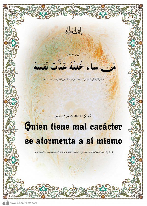 Jesús hijo de María (a.s.): -Solía decir-: Quien tiene mal carácter se atormenta a sí mismo.[2]