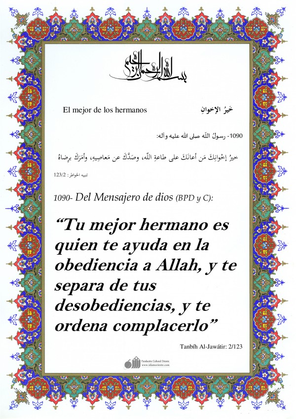Del Mensajero de Allah (BPDyC): “Tu mejor hermano es quien te ayuda en la obediencia a Allah, y te separa de tus desobediencias, y te ordena complacerlo”