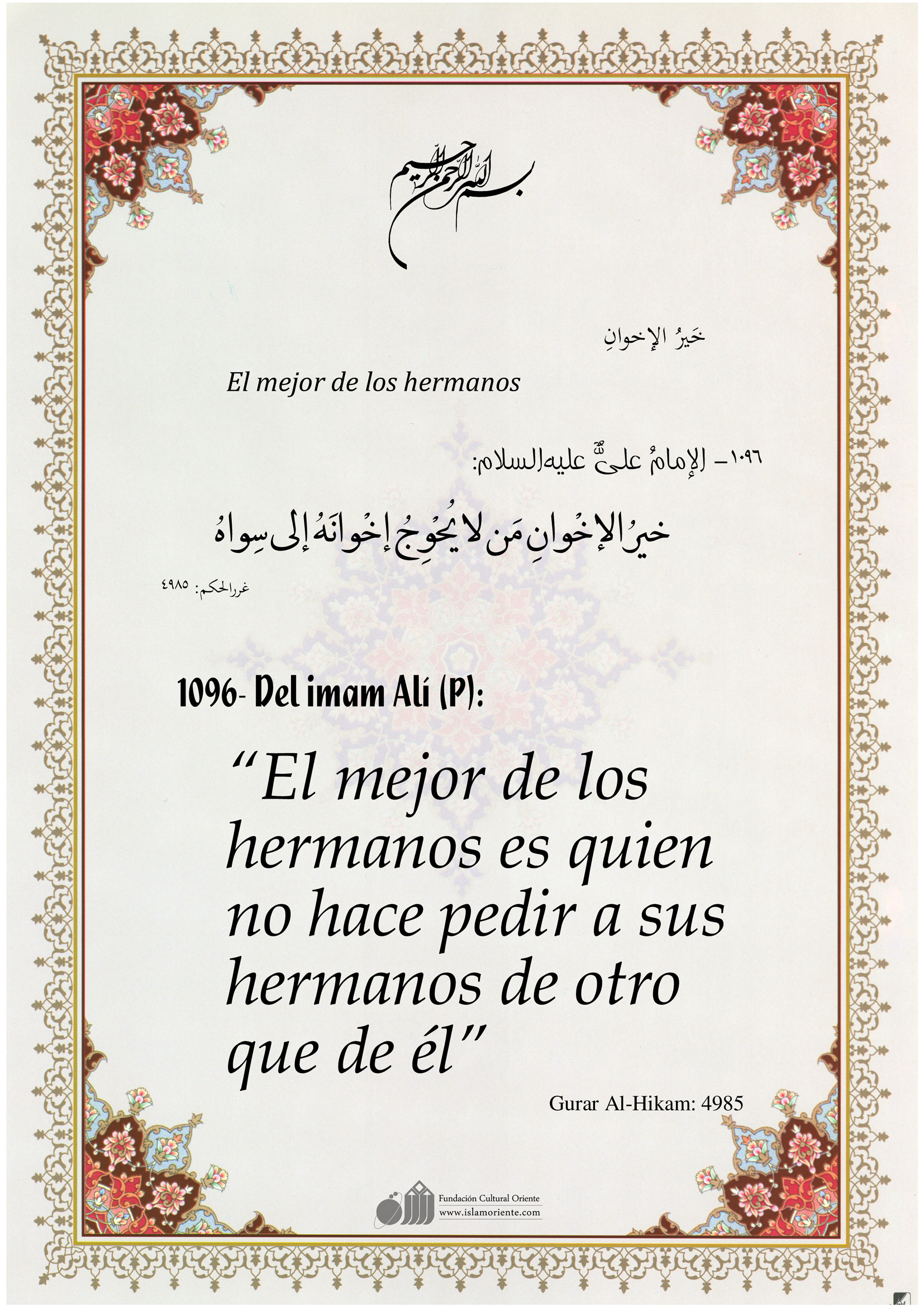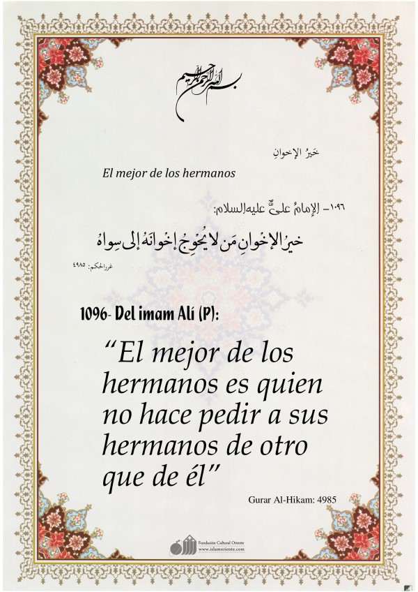 Del imam Alí (P): “El mejor de los hermanos es quien no hace pedir a sus hermanos de otro que de él”