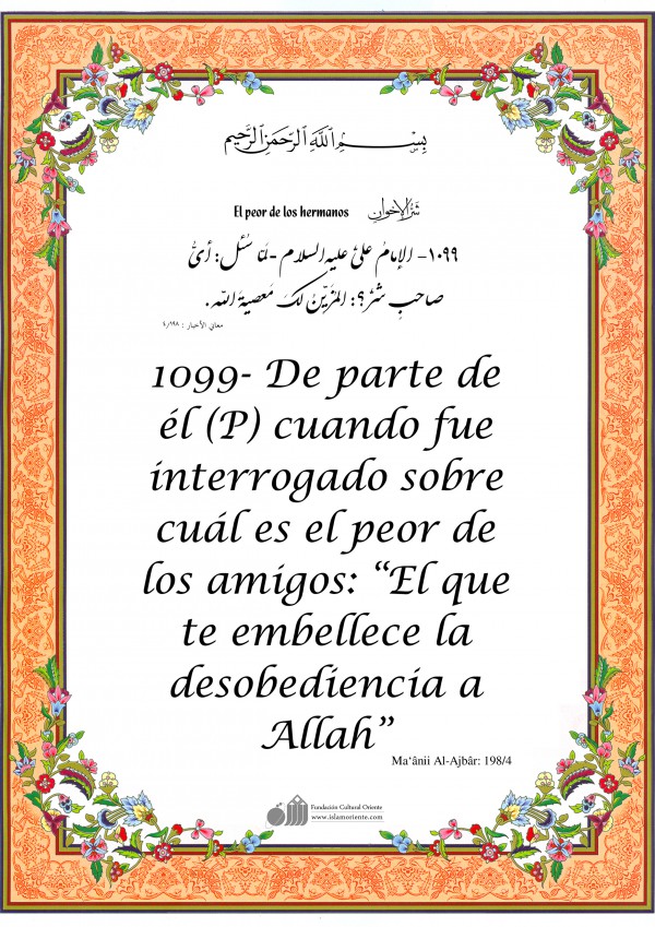 Del imam Alí (P) cuando fue interrogado sobre cuál es el peor de los amigos: “El que te embellece la desobediencia a Allah”