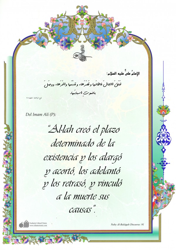 Del Imam Alí (P): “Al-lah creó el plazo determinado de la existencia y los alargó y acortó, los adelantó y los retrasó, y vinculó a la muerte sus causas”.