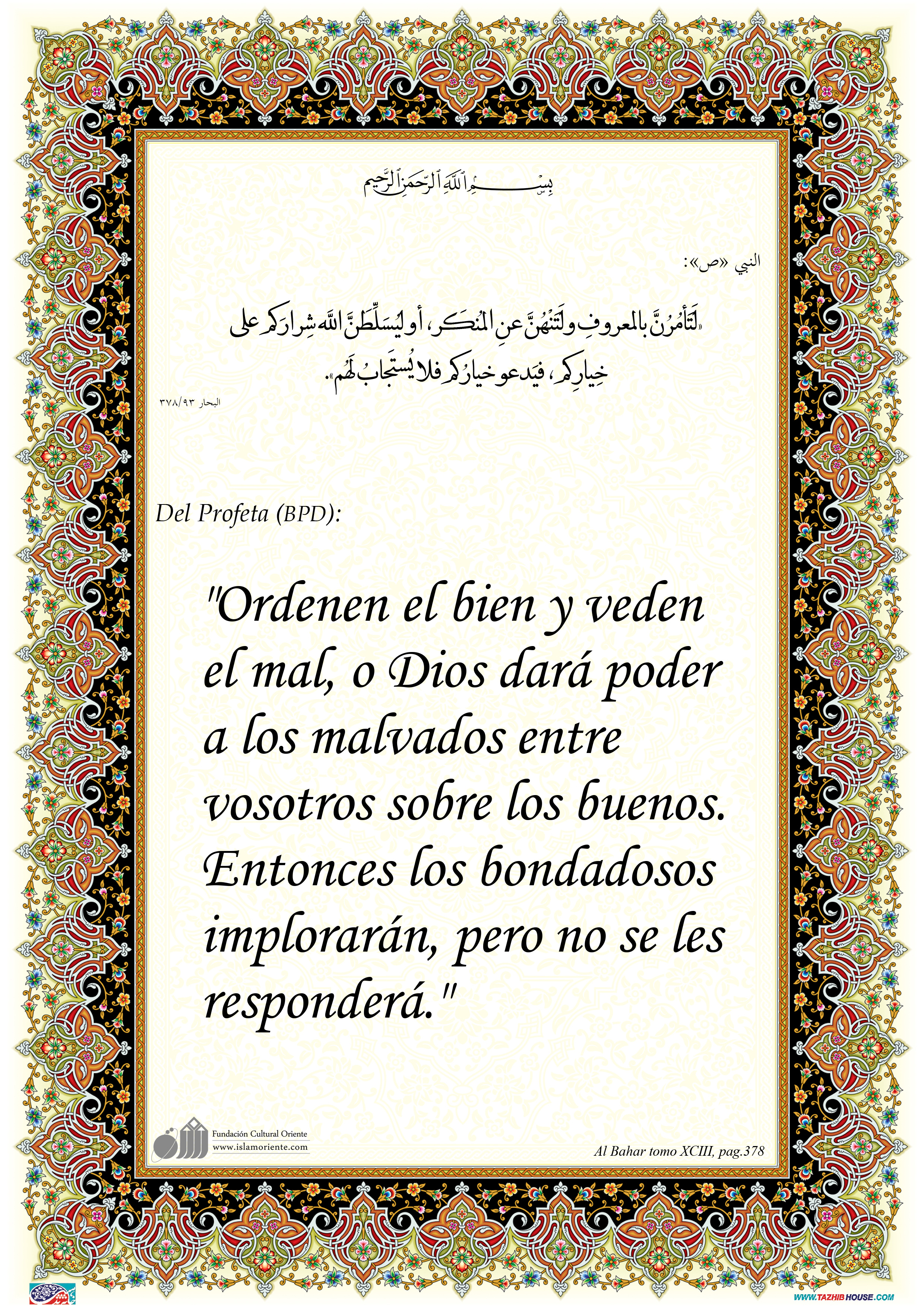 Del Profeta (BPD): "Ordenen el bien y veden el mal, o Dios dará poder a los malvados entre vosotros sobre los buenos. Entonces los bondadosos implorarán, pero no se les responderá."