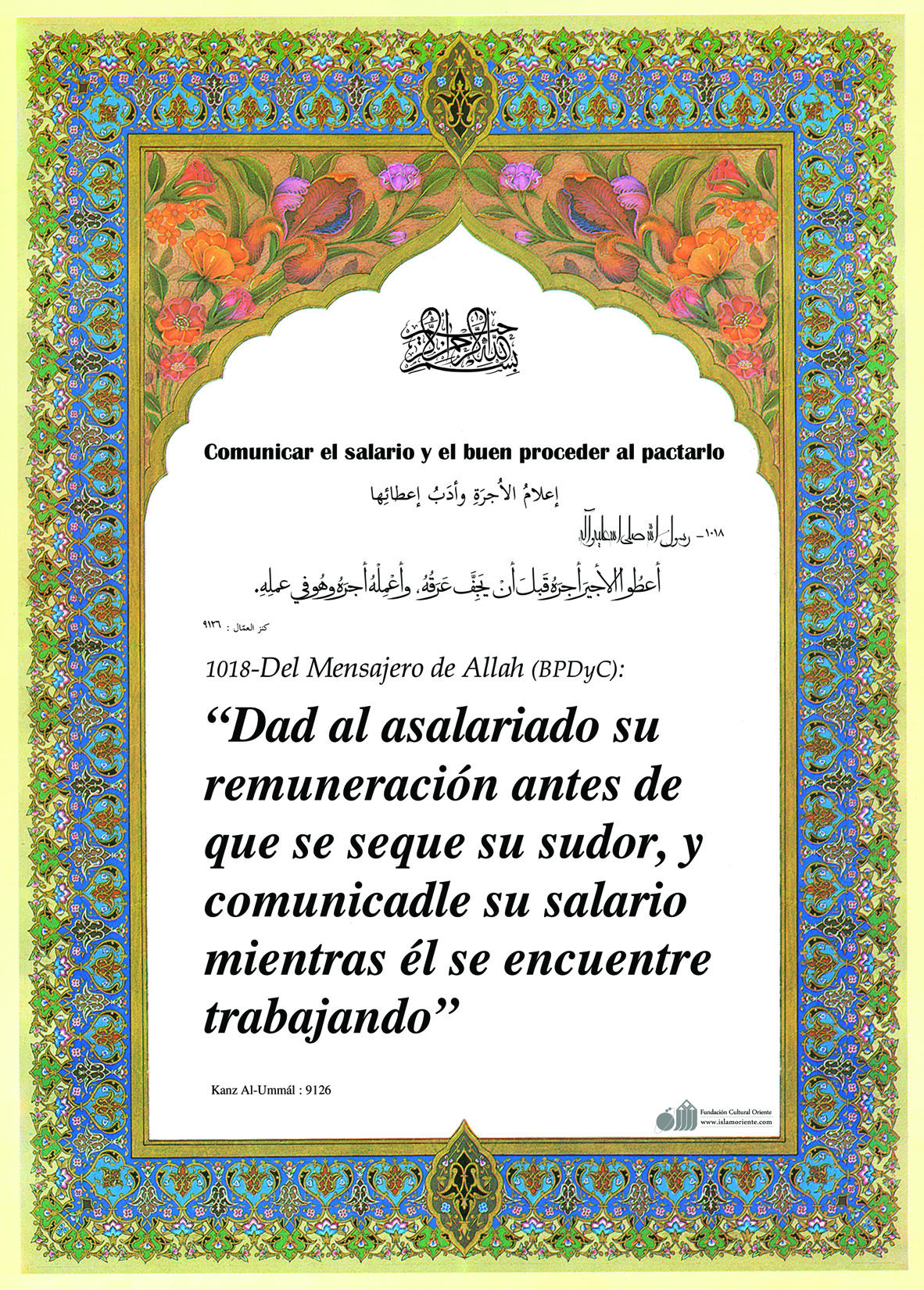 Del Mensajero de Allah (BPDyC): “Dad al asalariado su remuneración antes de que se seque su sudor, y comunicadle su salario mientras él se encuentre trabajando”