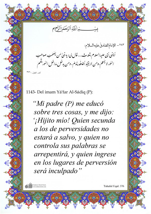 Del imam Yá'far Al-Sádiq (P): “Mi padre (P)[1] me educó sobre tres cosas, y me dijo: ‘¡Hijito mío! Quien secunda a los de perversidades no estará a salvo, y quien no controla sus palabras se arrepentirá, y quien ingrese en los lugares de perversión será inculpado”