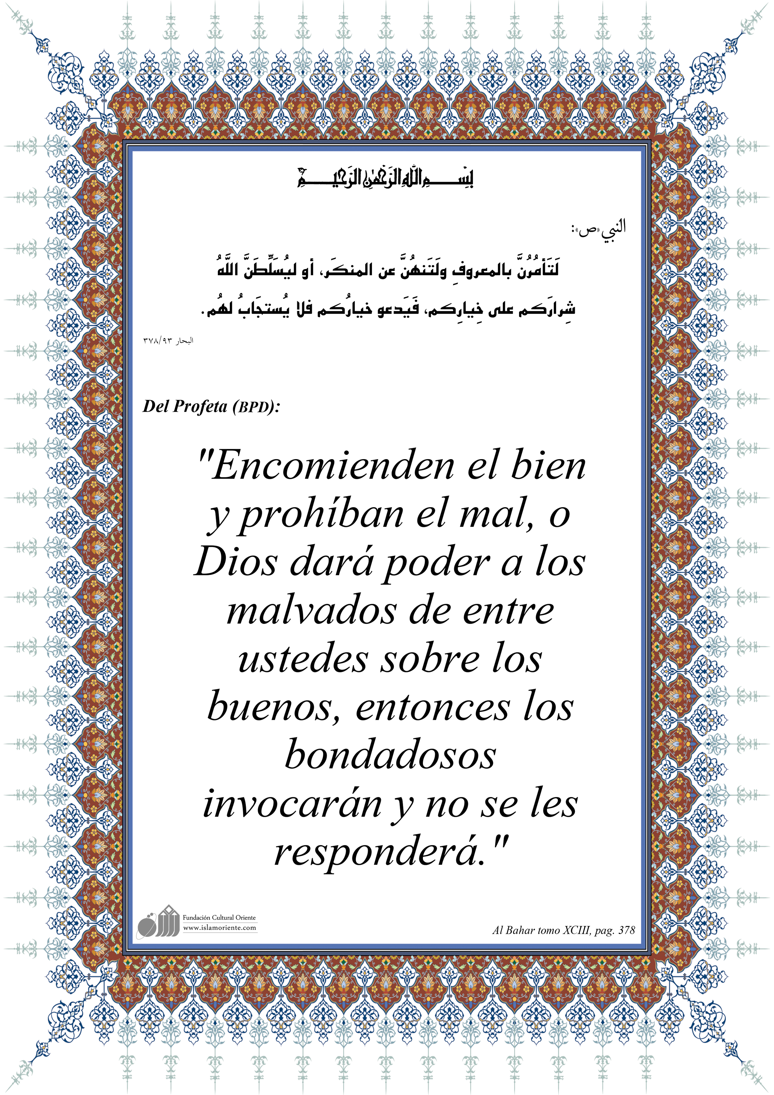 Del Profeta (BPD): "Encomienden el bien y prohíban el mal, o Dios dará poder a los malvados de entre ustedes sobre los buenos, entonces los bondadosos invocarán y no se les responderá."