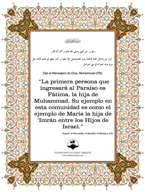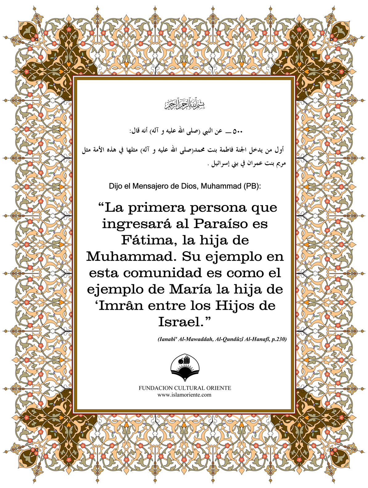 Dijo el Mensajero de Dios (PB): “La primera persona que ingresará al Paraíso es Fátima, la hija de Muhammad. Su ejemplo en esta comunidad es como el ejemplo de María la hija de ‘Imrân entre los Hijos de Israel.”