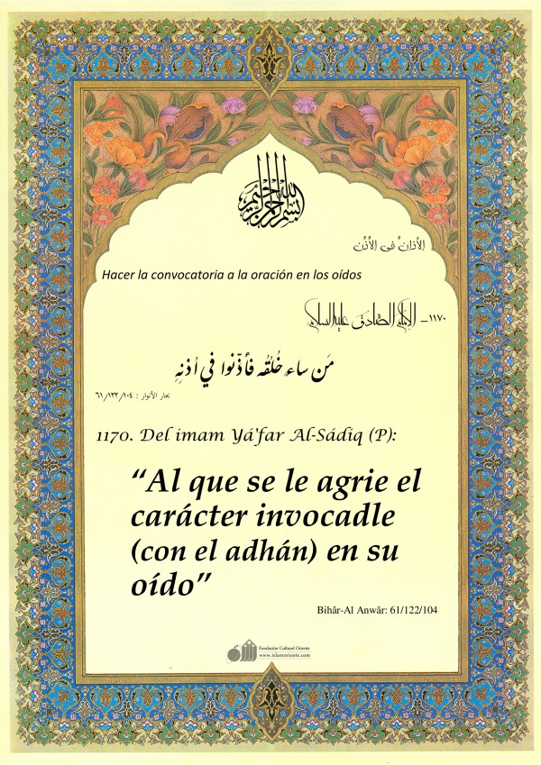 Del imam Yá'far Al-Sádiq (P): “Al que se le agrie el carácter invocadle (con el adhán) en su oído”