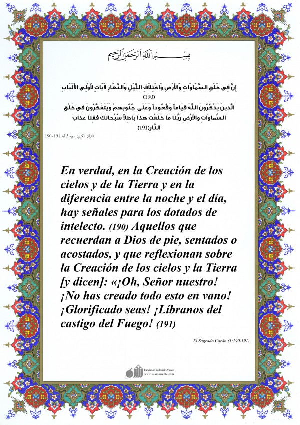 En verdad, en la Creación de los cielos y de la Tierra y en la diferencia entre la noche y el día, hay señales para los dotados de intelecto. (190) Aquellos que recuerdan a Dios de pie, sentados o acostados, y que reflexionan sobre la Creación de los cielos y la Tierra [y dicen]: « ¡Oh, Señor nuestro! ¡No has creado todo esto en vano! ¡Glorificado seas! ¡Líbranos del castigo del Fuego! (191)