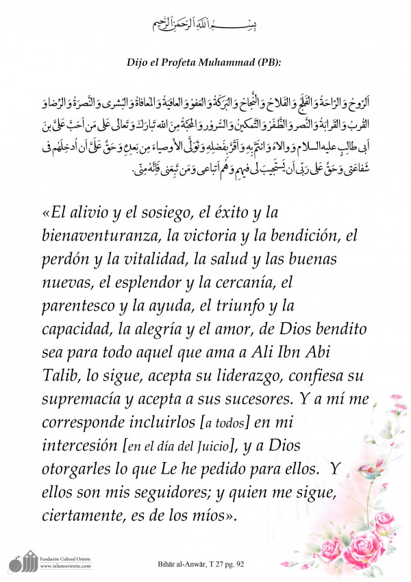 Dijo el Profeta Muhammad (PB): «El alivio y el sosiego, el éxito y la bienaventuranza, la victoria y la bendición, el perdón y la vitalidad, la salud y las buenas nuevas, el esplendor y la cercanía, el parentesco y la ayuda, el triunfo y la capacidad, la alegría y el amor, de Dios bendito sea para todo aquel que ama a Ali Ibn Abi Talib, lo sigue, acepta su liderazgo, confiesa su supremacía y acepta a sus sucesores. Y a mí me corresponde incluirlos [a todos] en mi intercesión [en el día del Juicio], y a Dios otorgarles lo que Le he pedido para ellos. Y ellos son mis seguidores; y quien me sigue, ciertamente, es de los míos».