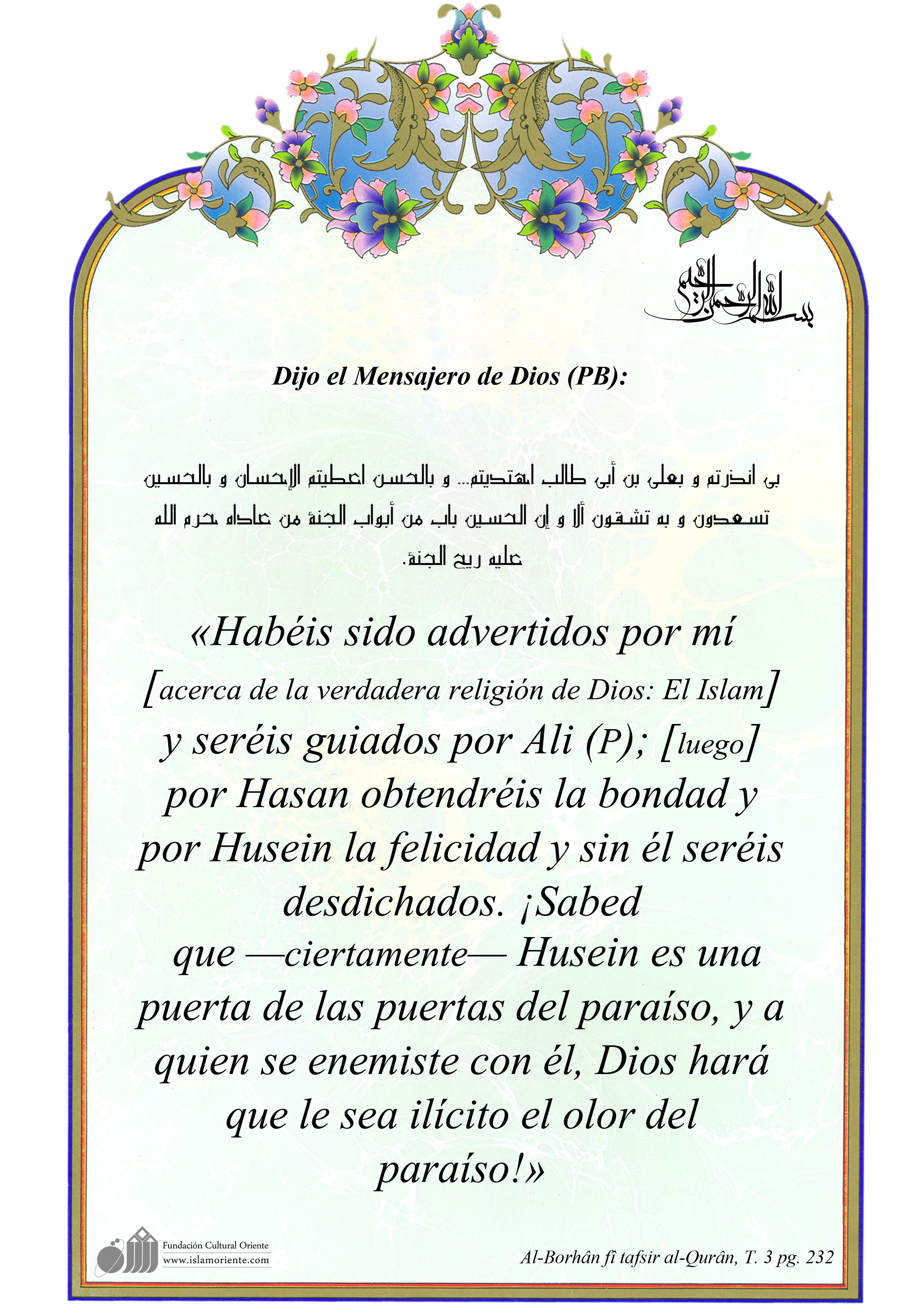 Dijo el Mensajero de Dios (PB): Habéis sido advertidos por mí [acerca de la verdadera religión de Dios: El Islam] y seréis guiados por Ali (P); [luego] por Hasan obtendréis la bondad y por Husein la felicidad y sin él seréis desdichados. ¡Sabed que —ciertamente— Husein es una puerta de las puertas del paraíso, y a quien se enemiste con él, Dios hará que le sea ilícito el olor del paraíso!