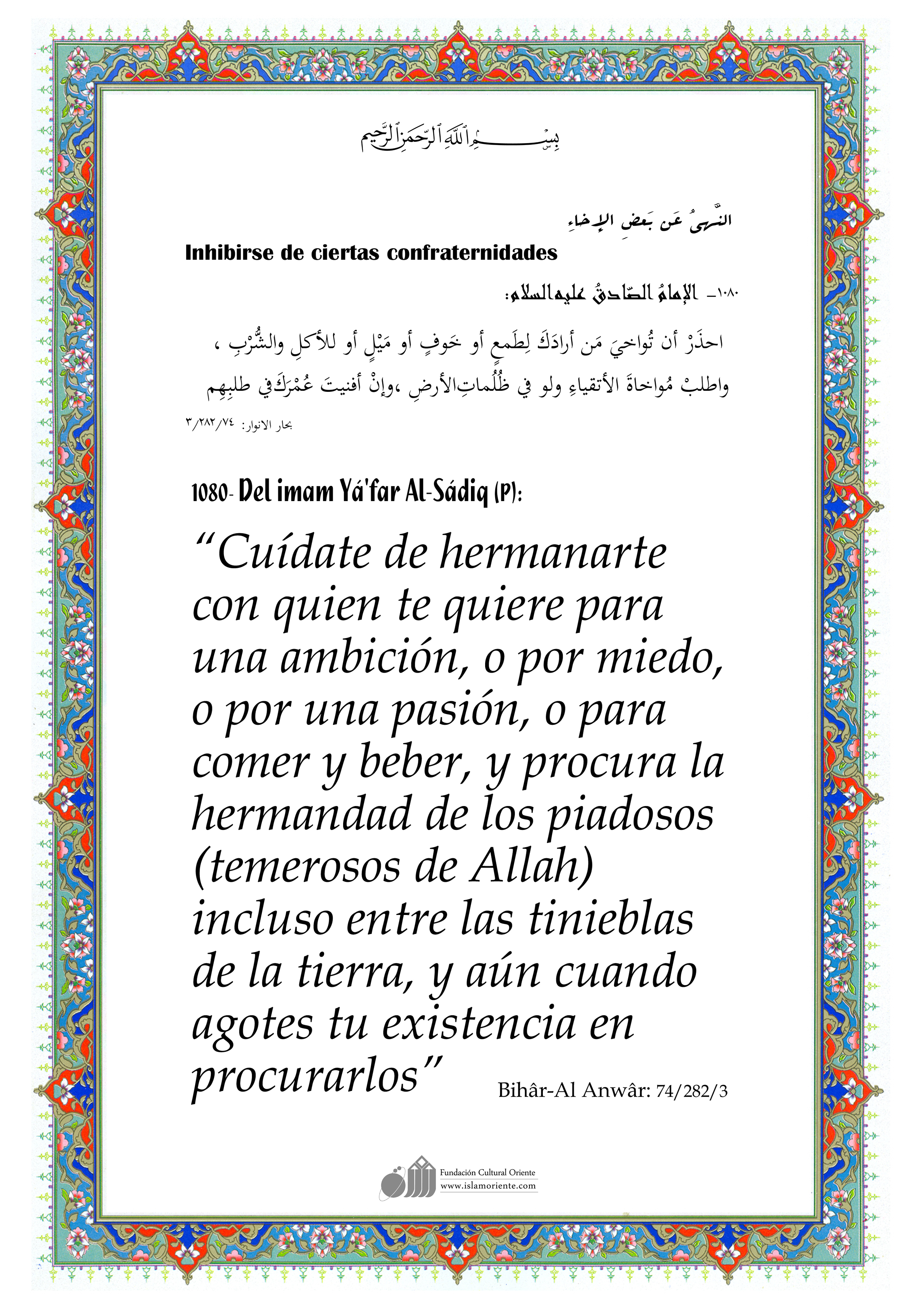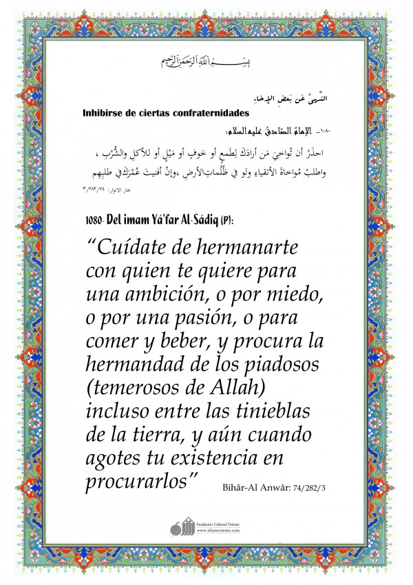 Del imam Yá'far Al-Sádiq (P): “Cuídate de hermanarte con quien te quiere para una ambición, o por miedo, o por una pasión, o para comer y beber, y procura la hermandad de los piadosos (temerosos de Allah) incluso entre las tinieblas de la tierra, y aún cuando agotes tu existencia en procurarlos”
