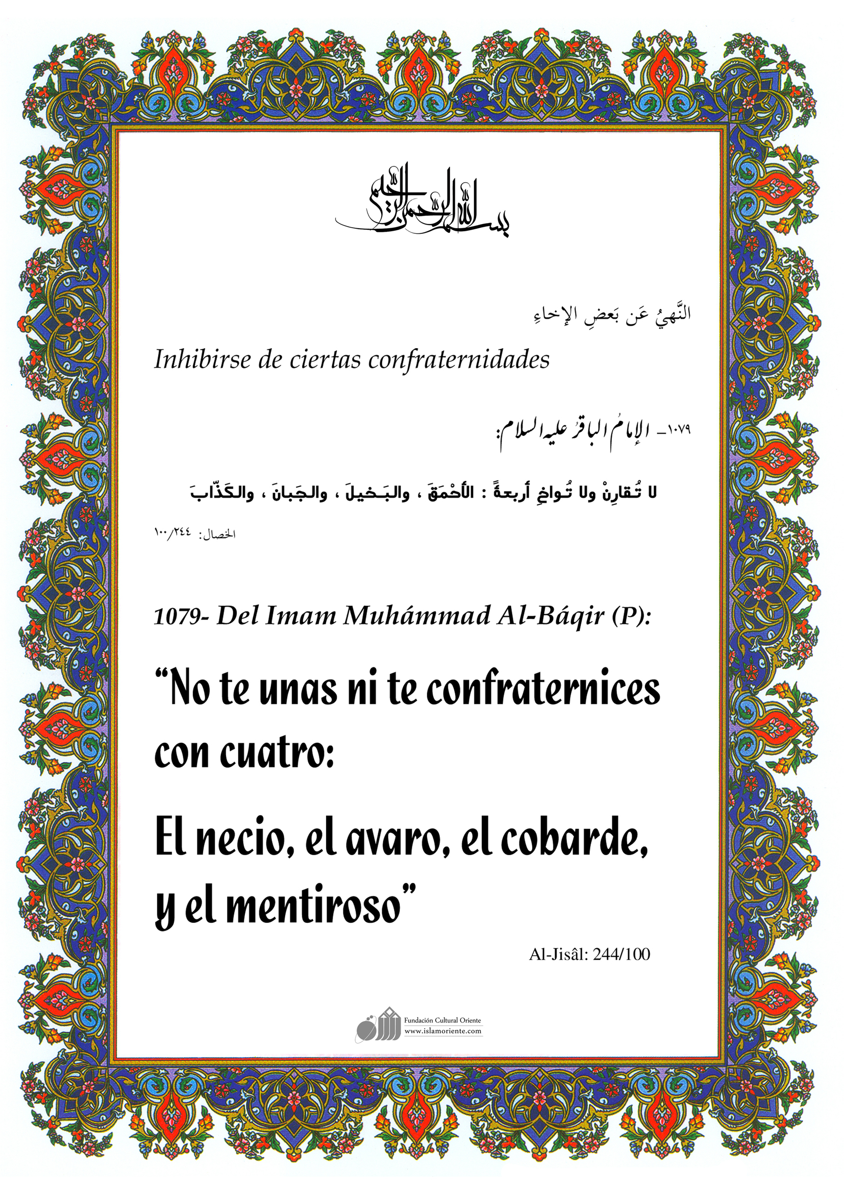 Del Imam Muhámmad Al-Báqir (P): “No te unas ni te confraternices con cuatro: El necio, el avaro, el cobarde, y el mentiroso”