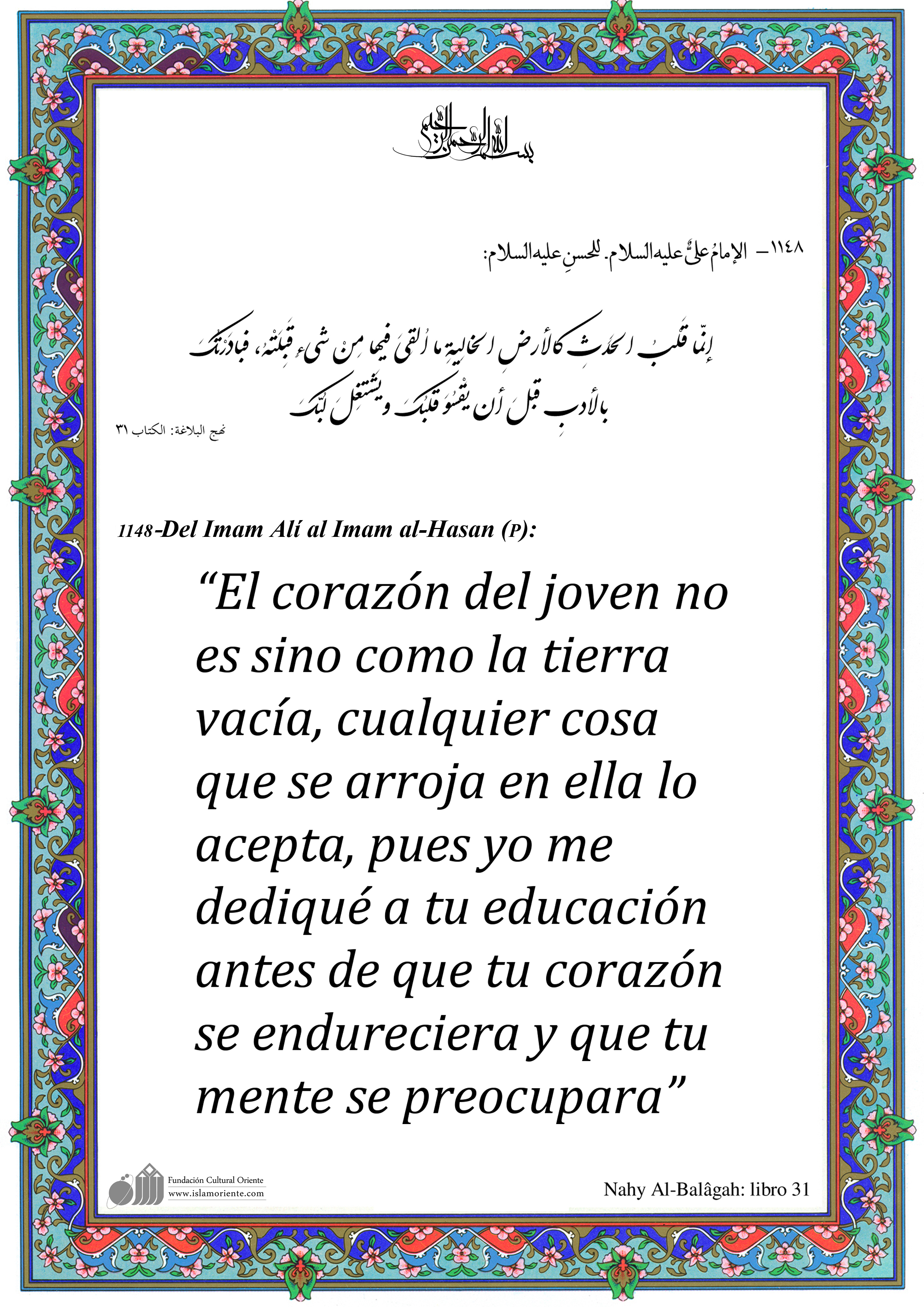 Del Imam Alí al Imam al-Hasan (P): “El corazón del joven no es sino como la tierra vacía, cualquier cosa que se arroja en ella lo acepta, pues yo me dediqué a tu educación antes de que tu corazón se endureciera y que tu mente se preocupara”