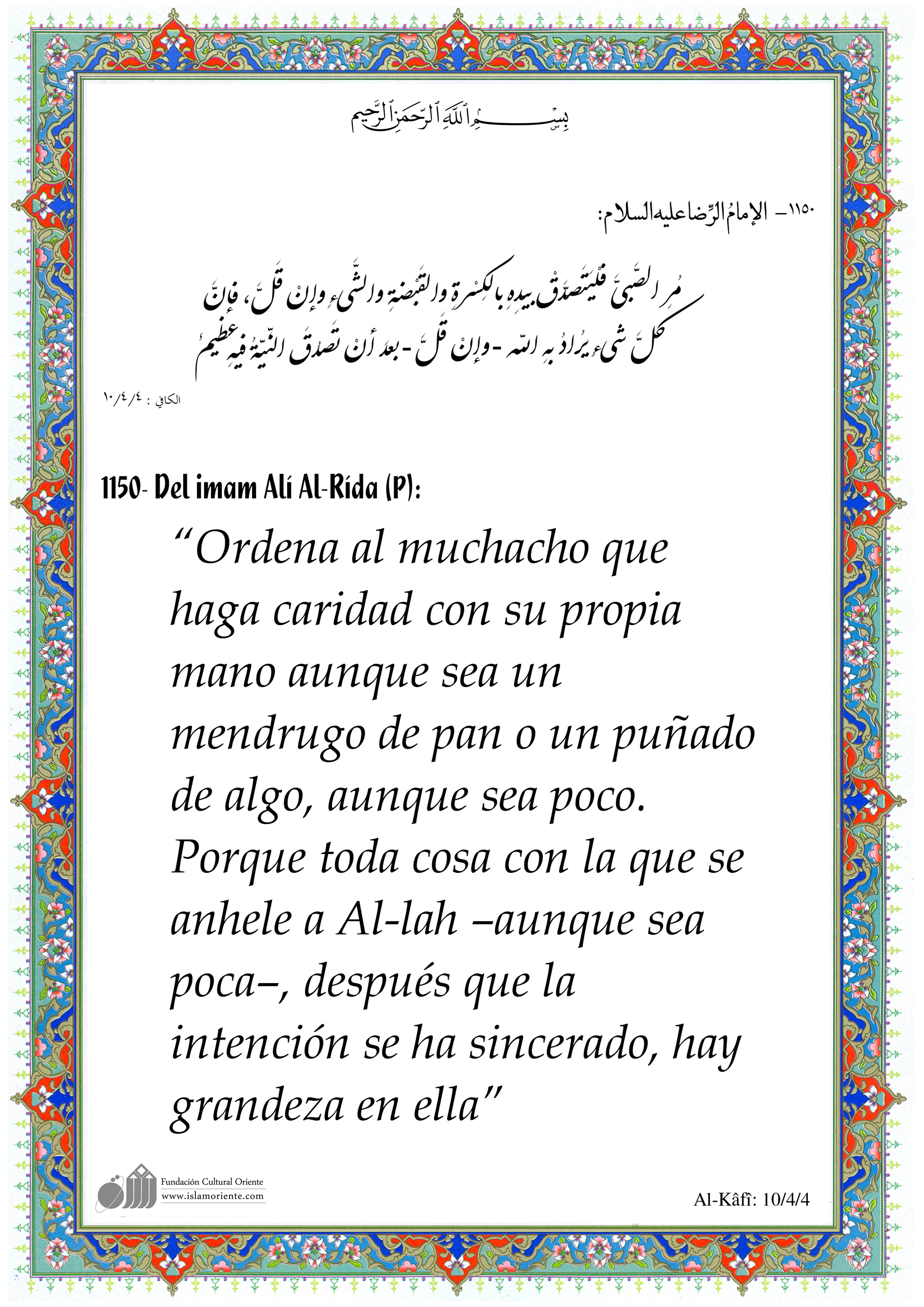 Del imam Alí Al-Rída (P): “Ordena al muchacho que haga caridad con su propia mano aunque sea un mendrugo de pan o un puñado de algo, aunque sea poco. Porque toda cosa con la que se anhele a Al-lah –aunque sea poca–, después que la intención se ha sincerado, hay grandeza en ella”