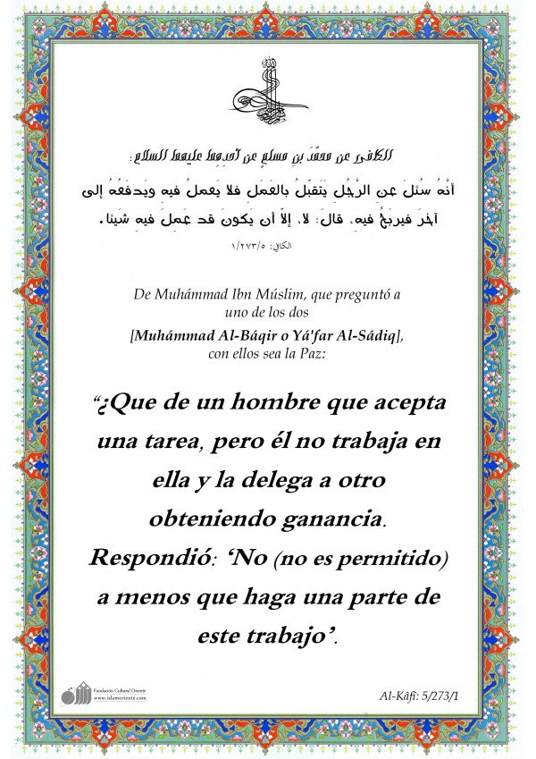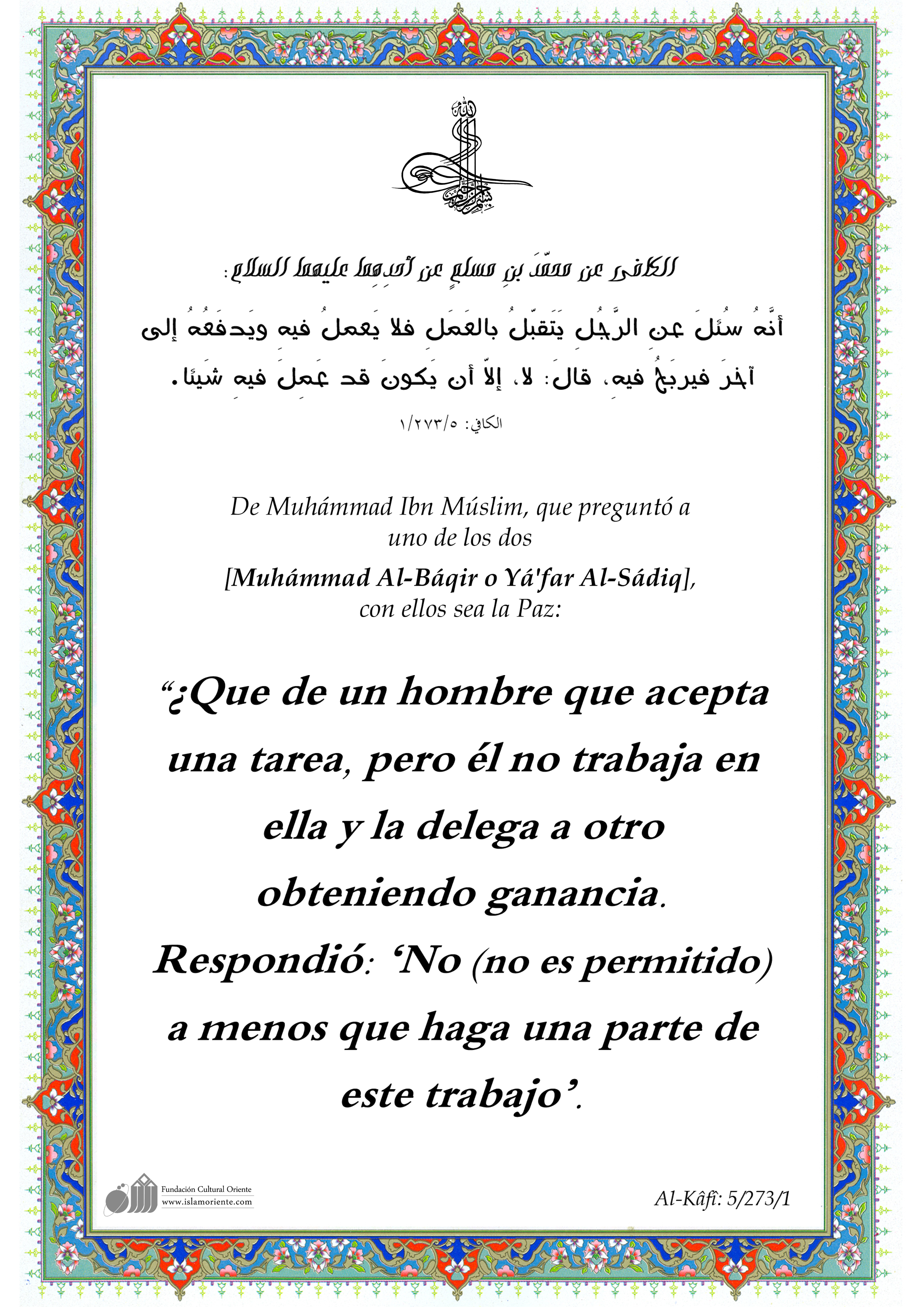 De Muhámmad Ibn Múslim, que preguntó a uno de los dos [Muhámmad Al-Báqir o Yá'far Al-Sádiq], con ellos sea la Paz: “¿Que de un hombre que acepta una tarea, pero él no trabaja en ella y la delega a otro obteniendo ganancia. Respondió: ‘No (no es permitido) a menos que haga una parte de este trabajo’.