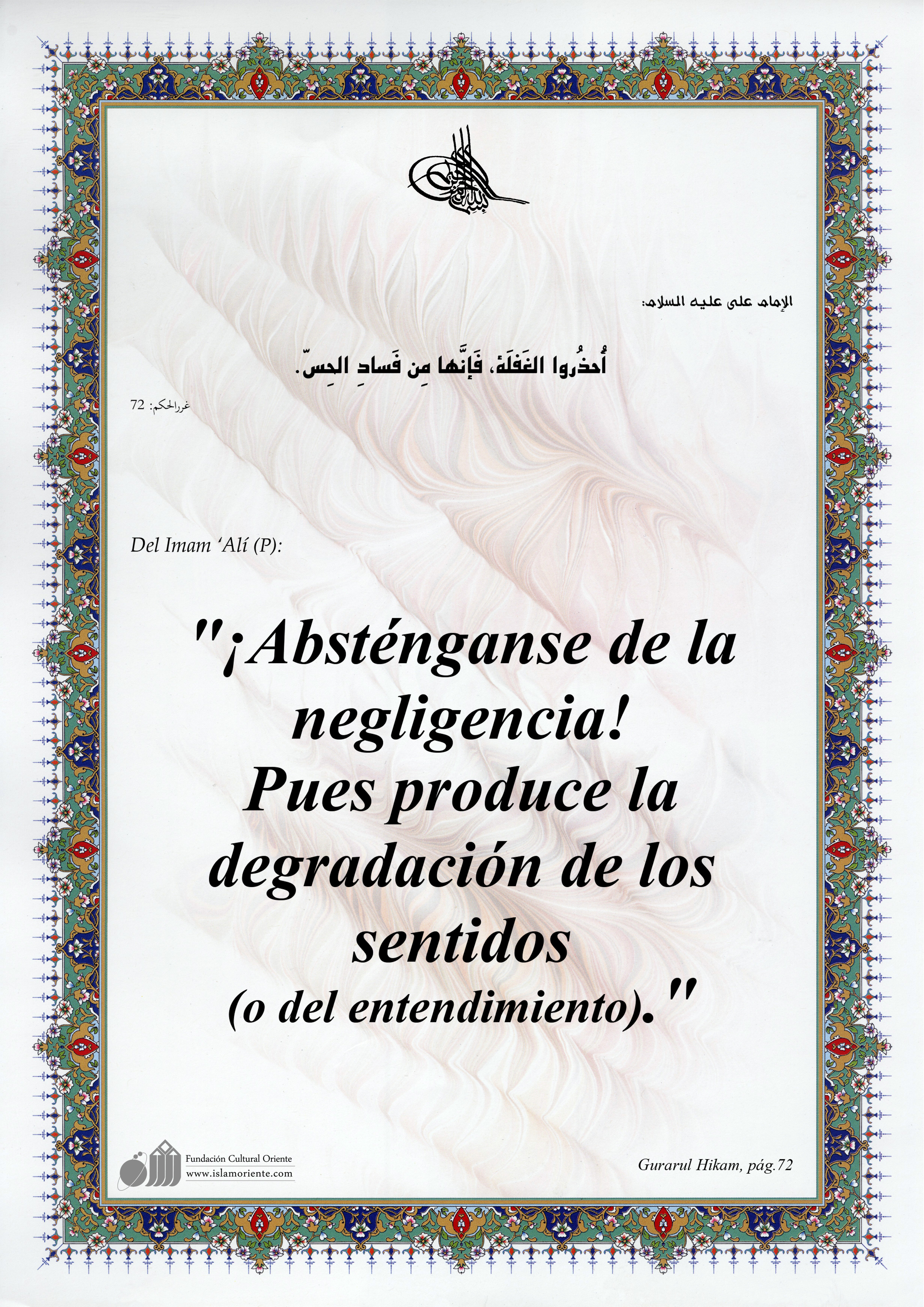 Del Imam ‘Alí (P): "¡Absténganse de la negligencia! Pues produce la degradación de los sentidos (o del entendimiento)."