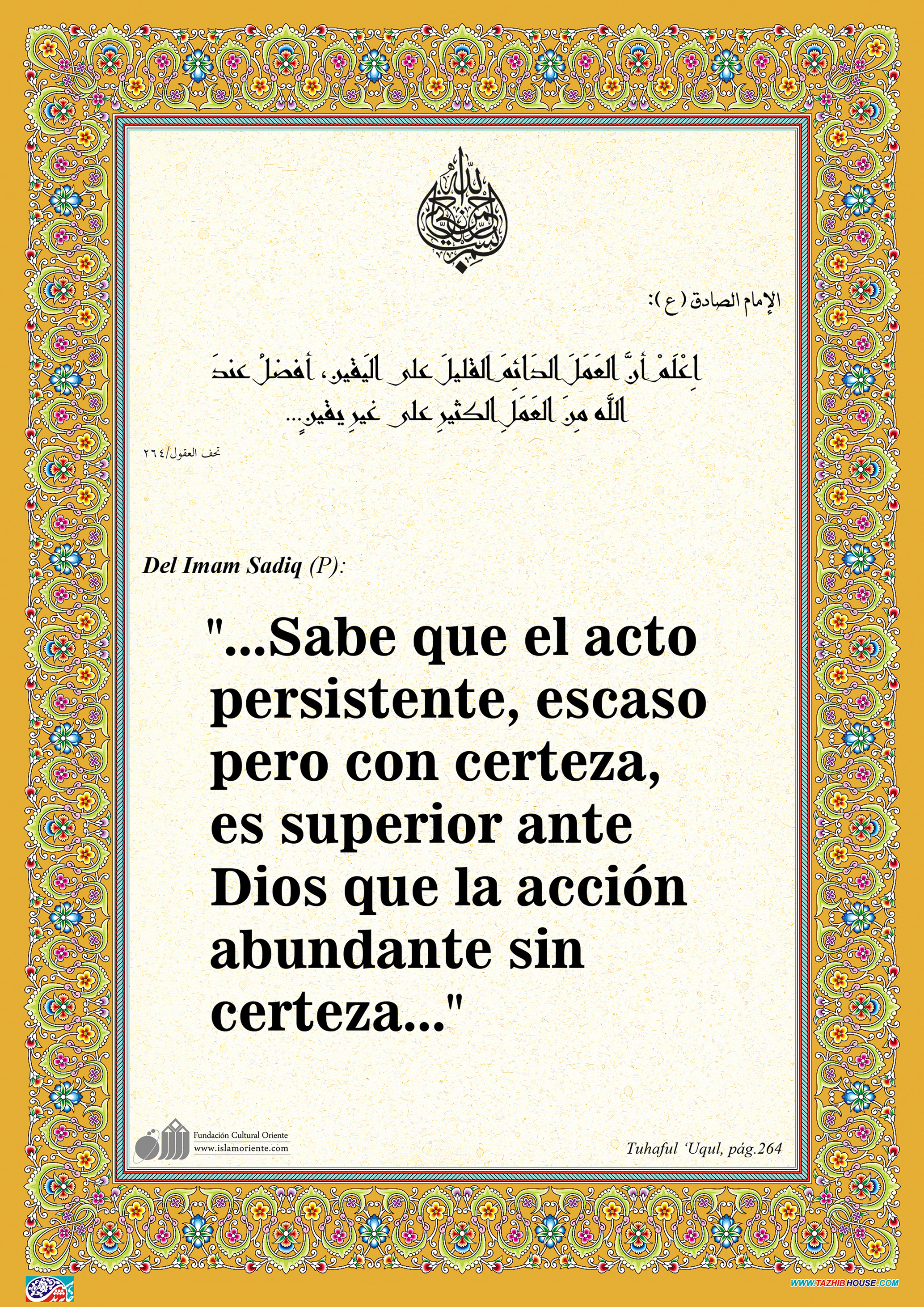 Del Imam Sadiq (P): "...Sabe que el acto persistente, escaso pero con certeza, es superior ante Dios que la acción abundante sin certeza..."