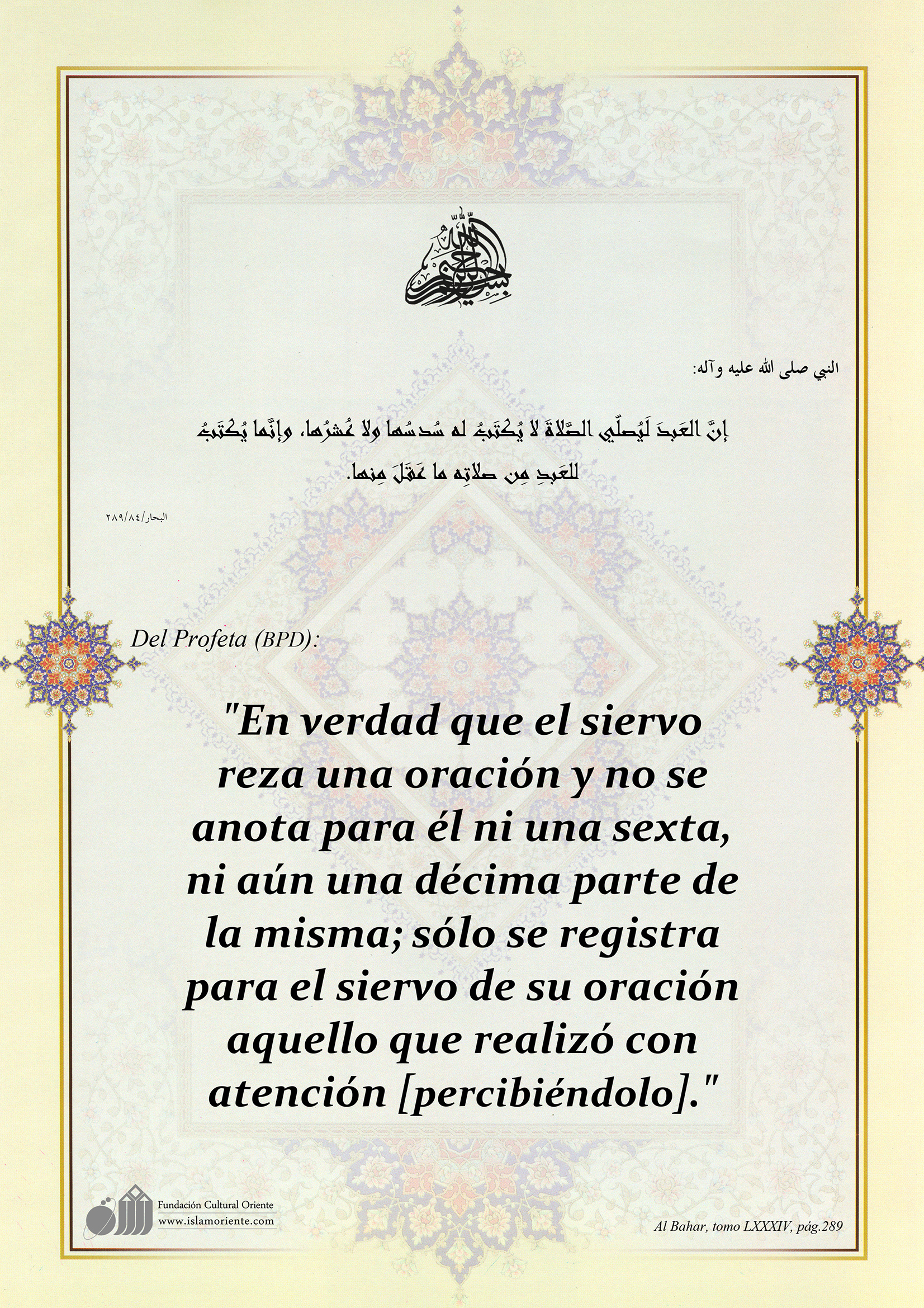 Del Profeta (BPD): "En verdad que el siervo reza una oración y no se anota para él ni una sexta, ni aún una décima parte de la misma; sólo se registra para el siervo de su oración aquello que realizó con atención [percibiéndolo]."