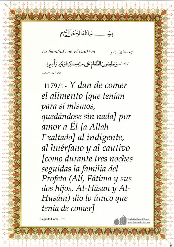 Y dan de comer el alimento [que tenían para sí mismos, quedándose sin nada] por amor a Él [a Allah Exaltado] al indigente, al huérfano y al cautivo [como durante tres noches seguidas la familia del Profeta (Alí, Fátima y sus dos hijos, Al-Hásan y Al-Husáin) dio lo único que tenía de comer]