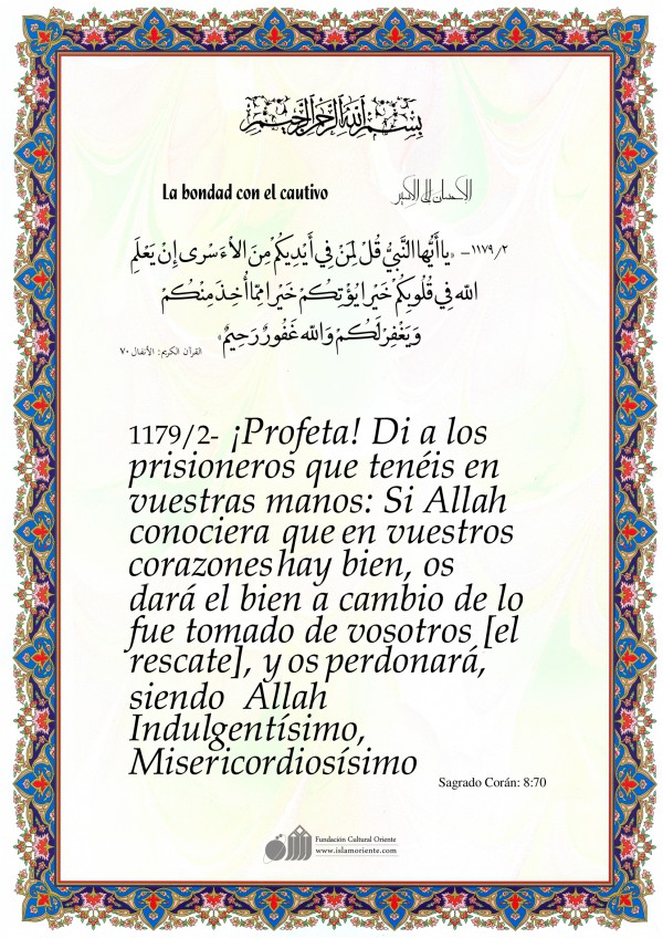 ¡Profeta! Di a los prisioneros que tenéis en vuestras manos: Si Allah conociera que en vuestros corazones hay bien, os dará el bien a cambio de lo fue tomado de vosotros [el rescate], y os perdonará, siendo Allah Indulgentísimo, Misericordiosísimo