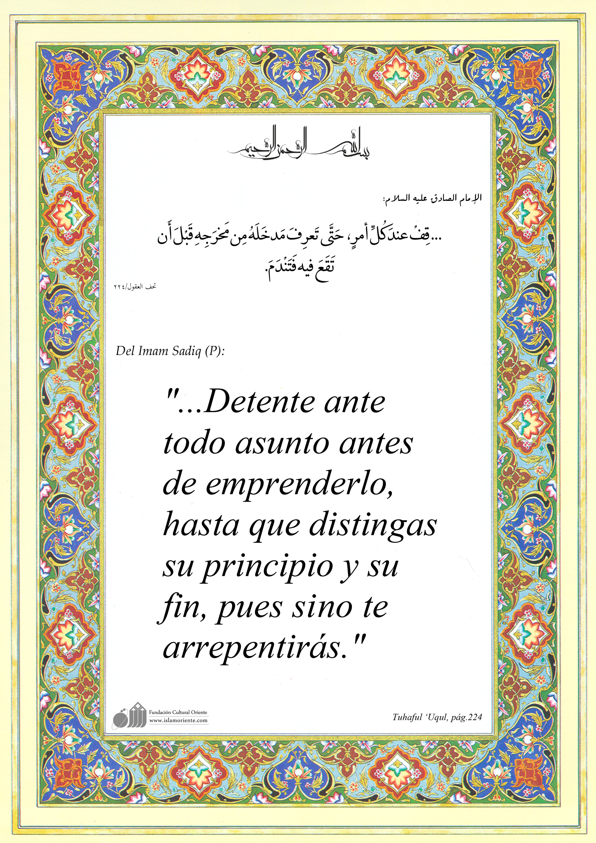Del Imam Sadiq (P): "...Detente ante todo asunto antes de emprenderlo, hasta que distingas su principio y su fin, pues sino te arrepentirás."
